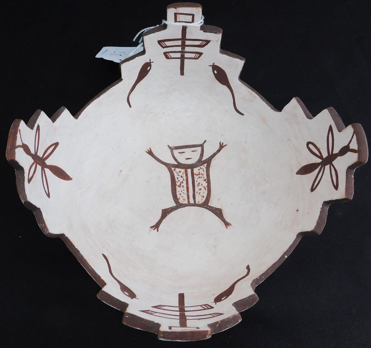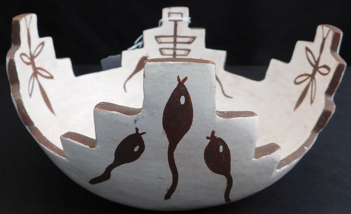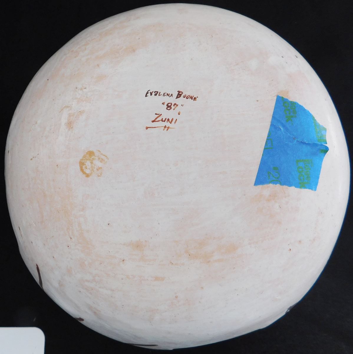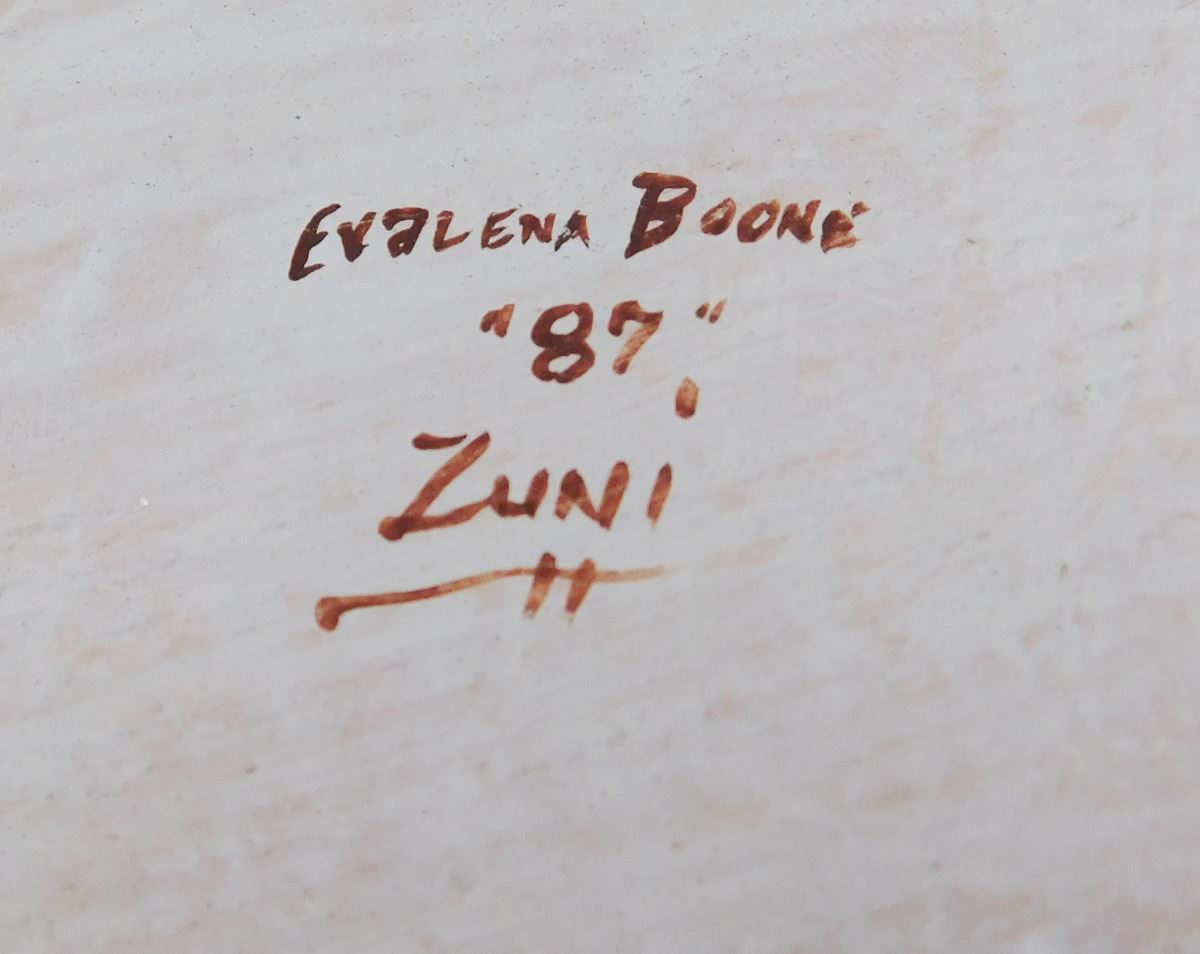 Zuni Polliwog Bowl signed by Evalena Boone, 1987 measuring 8x8x3.5 inches Very good condition. See images. Dragonflies, tadpoles and frog figure in center. Shipping $18.50