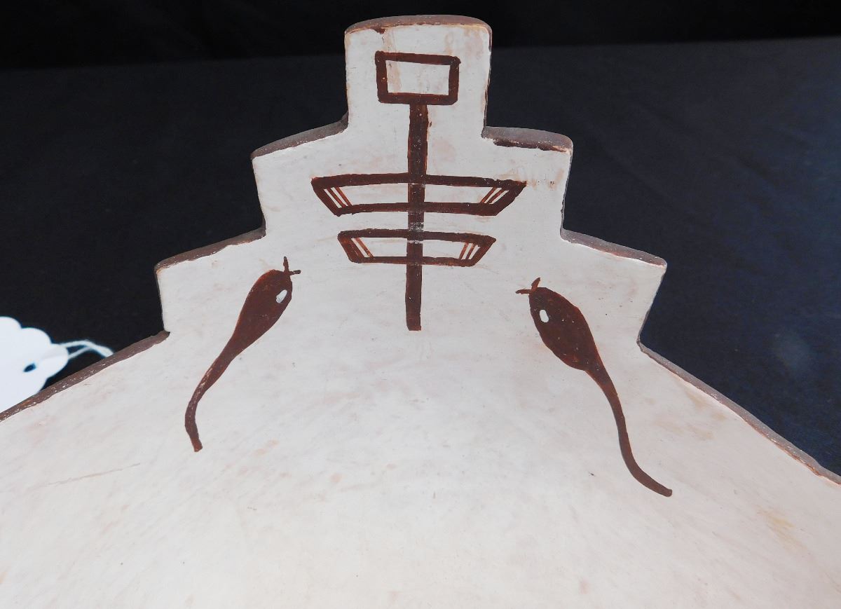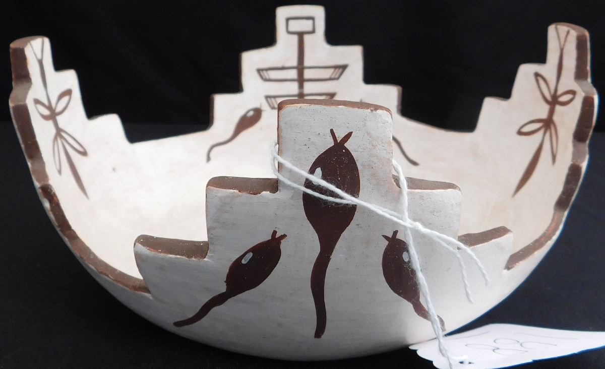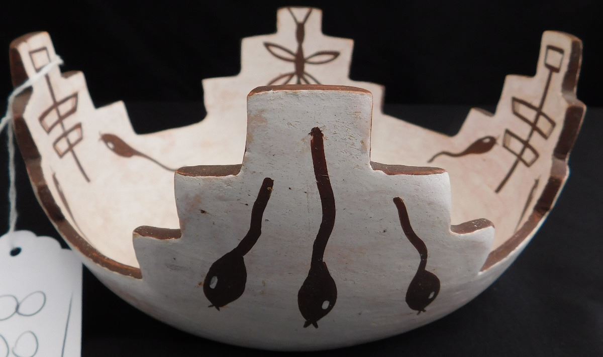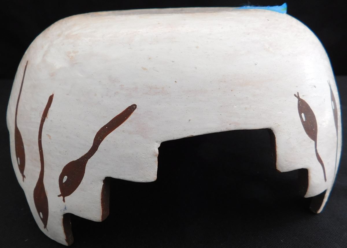 Zuni Polliwog Bowl signed by Evalena Boone, 1987 measuring 8x8x3.5 inches Very good condition. See images. Dragonflies, tadpoles and frog figure in center. Shipping $18.50