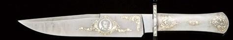 Fancy blued and gold decorated Bowie knife by Gigand, serial #0755. Shows portrait of Jim Bowie and design signed F. Carter, Texas. The knife measures 12-7/8” overall with 8-1/4” clipped point blade, fine to excellent condition, very good condition. From the Bernard Braverman Estate. Est: $350 - $700