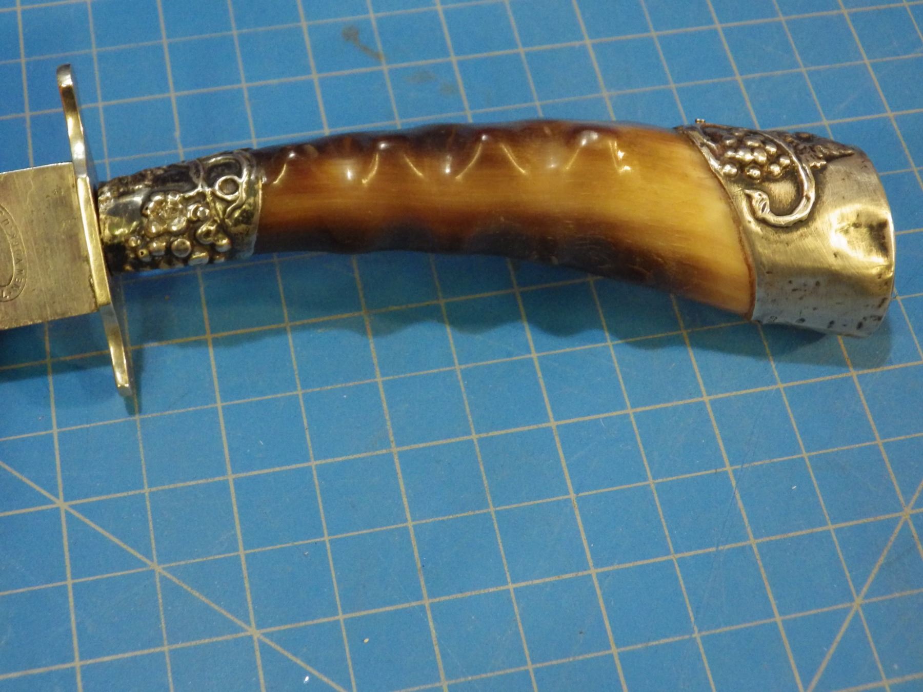 Fancy bowie knife , carved horn handle with silver grape fittings, 7 1/4" blade marked "Tiffany, Bro