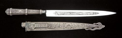 Fancy cast silver-alloy mounted goucho knife with blade by Inox. Fancy engraved mounts, fancy etched blade, circa early to mid 20th century. Approx. 12-7/8” overall with 8-1/4” blade. Est: $200 - $400