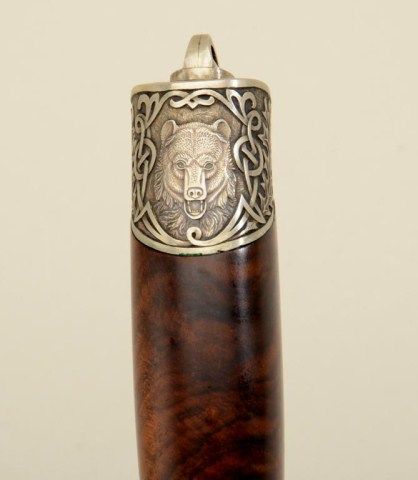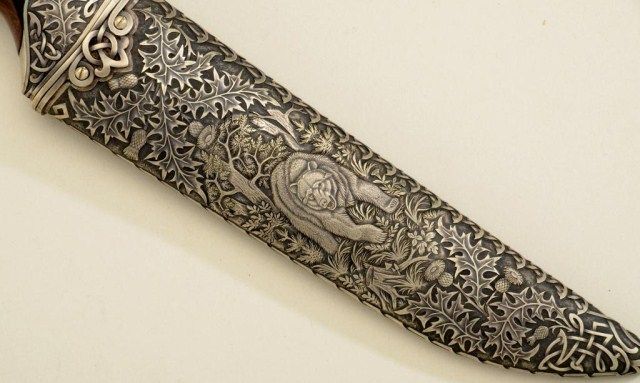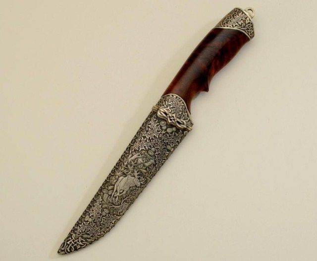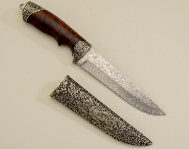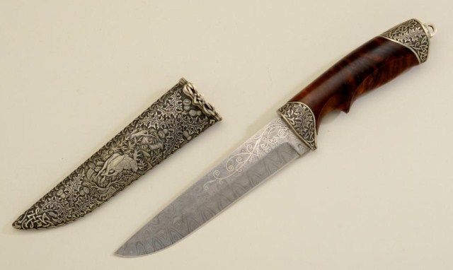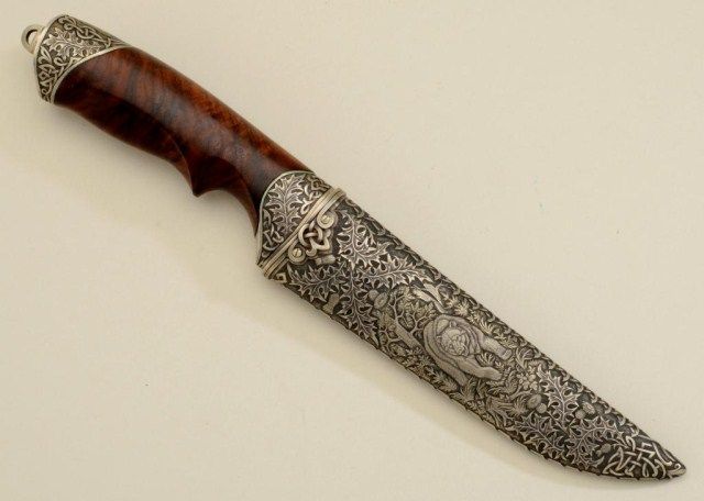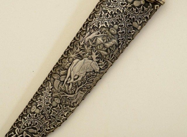 Fancy hunting knife with select wood grip; shows pattern steel plate with silver inlay, 12”, Eastern European; possibly East German or Hungarian; cast decoration, hand chased, not chiseled or hand cut. From the estate of Robert Petersen. Est.: $300-$600.
