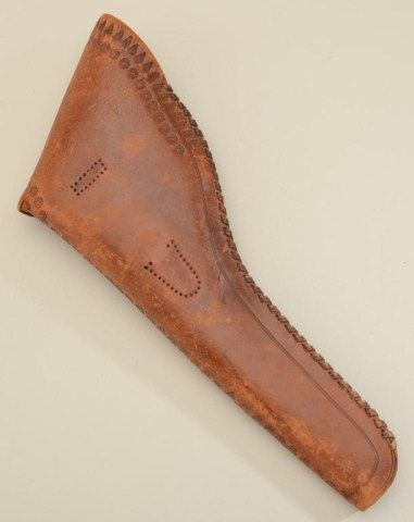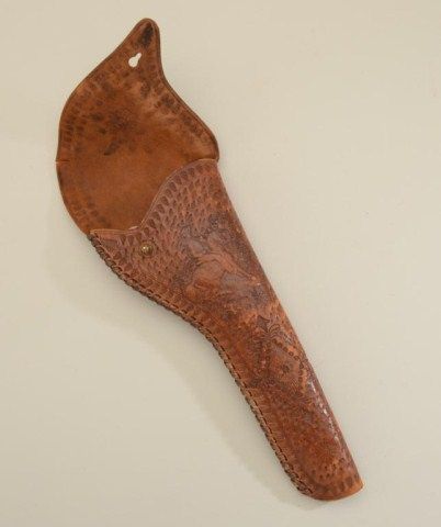 Fancy large tooled leather flap holster with embossed cowboy on horse for a Colt Model 1878 or large frame Merwin and Hulbert revolver, unmarked maker but possibly a Royal brand in overall very good condition,missing belt loop on back. Est.: $200-$400.