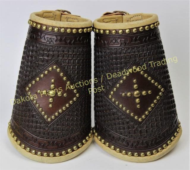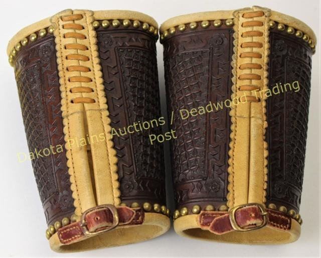 Fancy pair large cowboy cuffs fully stamped and spotted, lined with contrasting leather, unmarked, e