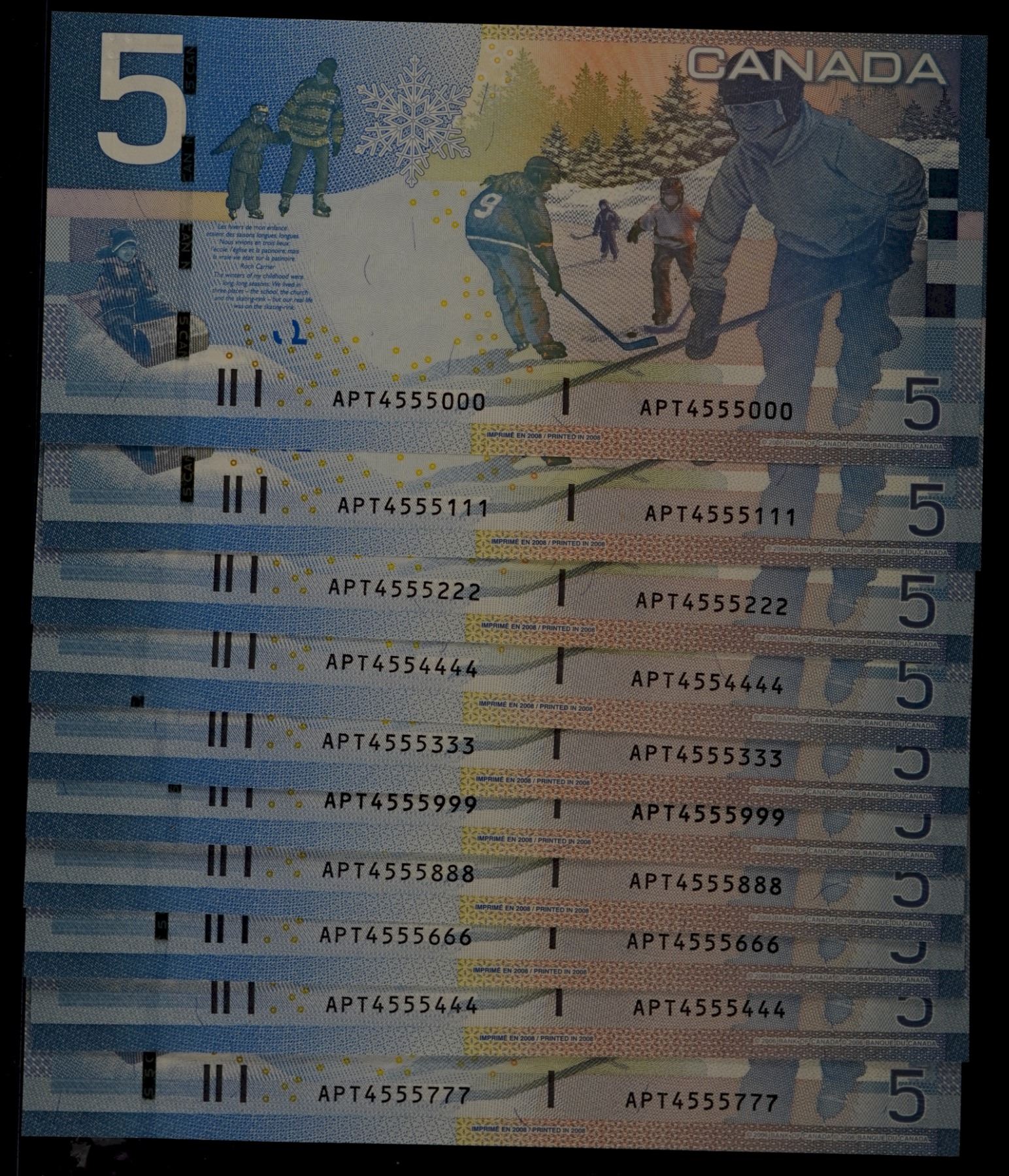 Fancy serial Numbered Set; 2006 $5 APT4555000-4555999 All 10 notes Uncirculated.