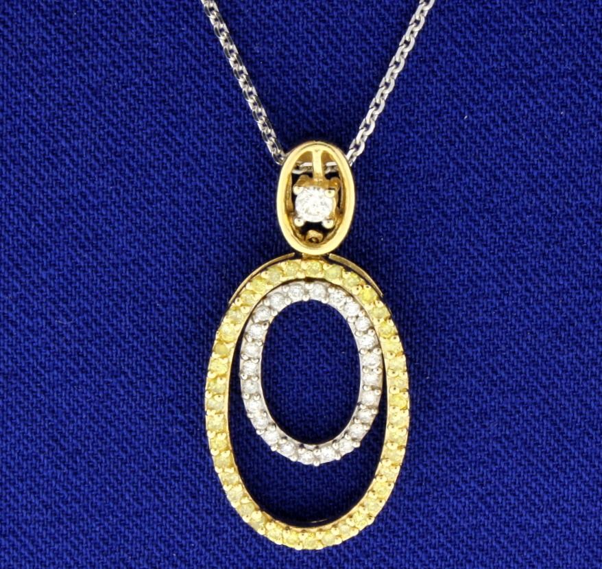 This stunning 14k yellow gold oval dangle style pendant is micro mini set with 3/4 carat of diamonds! Of the 63 diamonds set, 38 are Fancy yellow and 25 are round brilliant cut. The diamonds are SI/VS and white in color, F-G! There is a very nice 22" adjustable chain in 14k white gold also. 5.09g