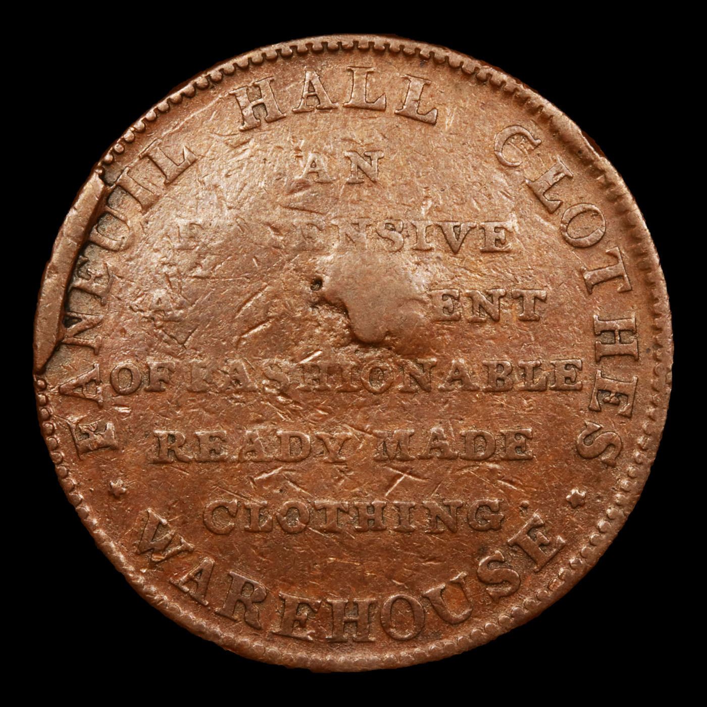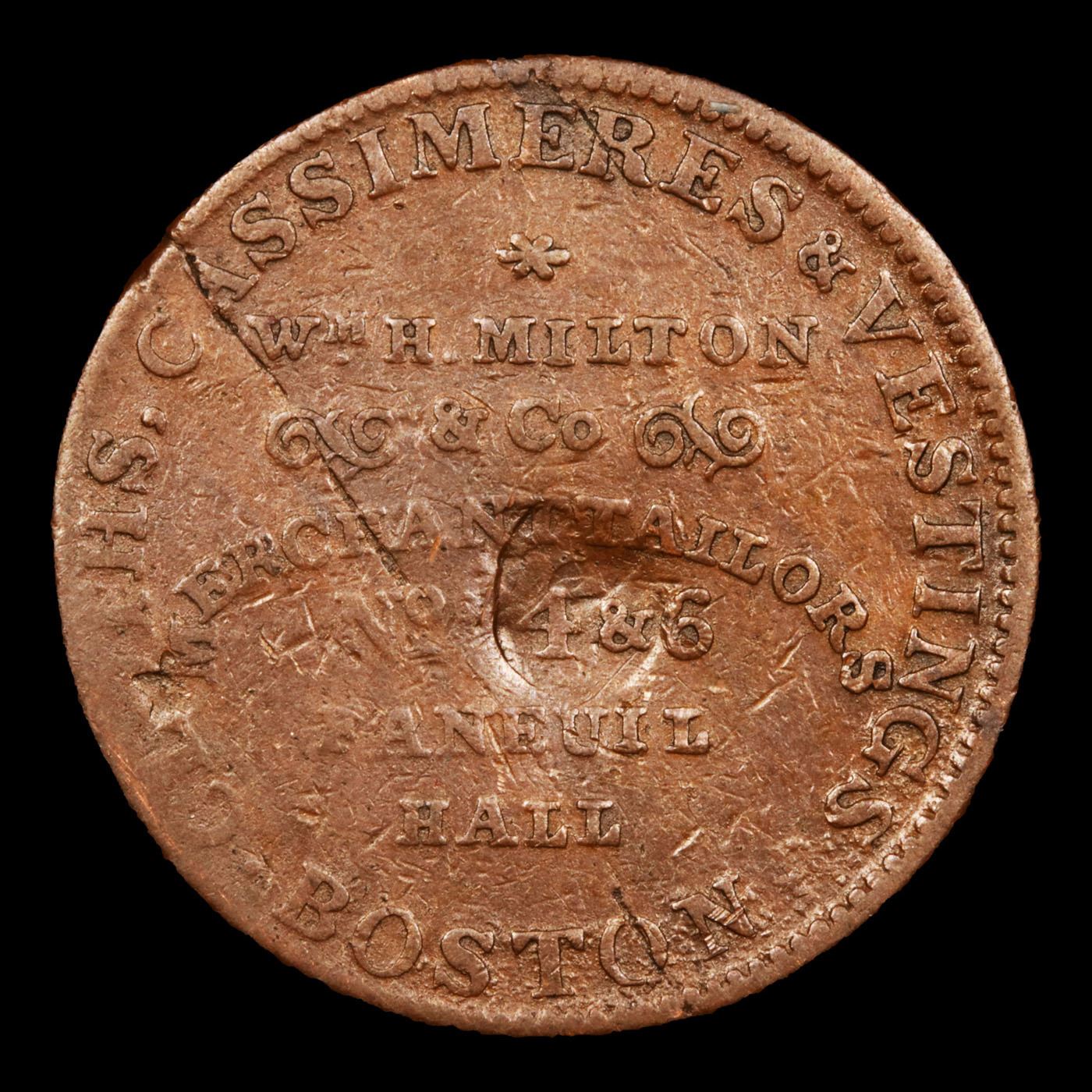 Faneuil Hall Clothes HT-165 Hard Times Token 1c Grades f details. The obverse text reads “Cloths, Cassimere's & Vestings, Boston, W.M.H. Milton & Co Merchant Tailors No.s. 4 & 6 Faneuil Hall” and the reverse text reads “Faneuil Hall Clothes Warehouse, An Extensive Assortment of Fashionable Ready Made Clothing.”