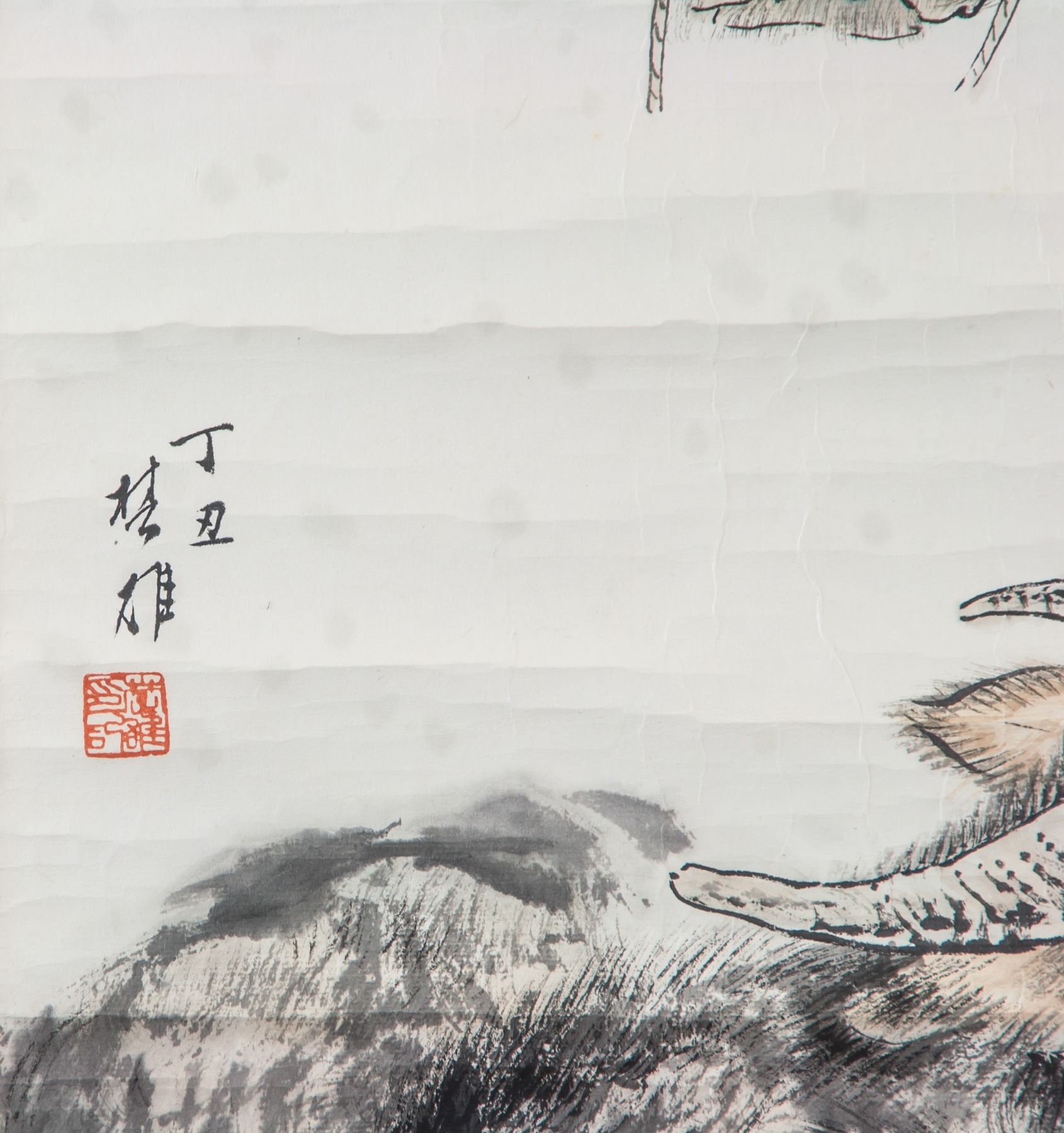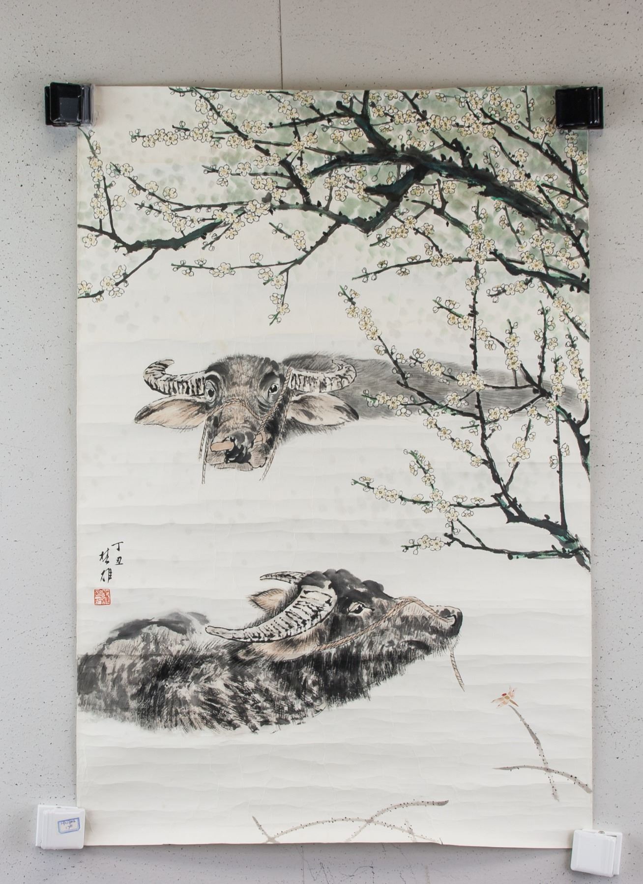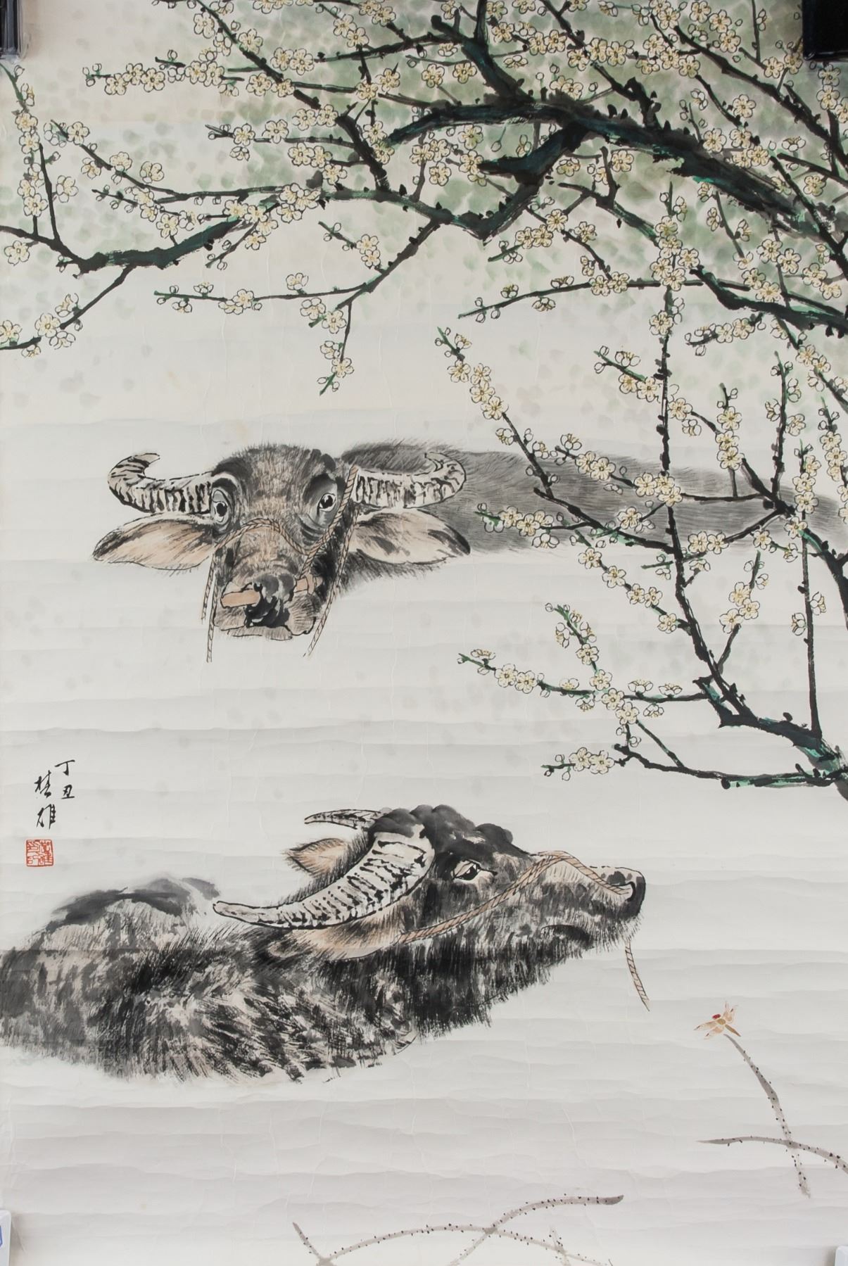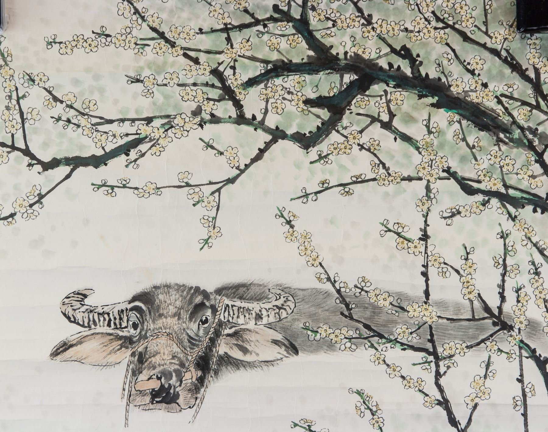 Two water buffaloes and flower; Chinese ink and watercolour on paper; signed Fang Chuxiong (b.1950), Chinese painter; inscribed with 1 artist seal; 68 cm x 45.5 cm; PROVENANCE: Forest Hill, Toronto estate