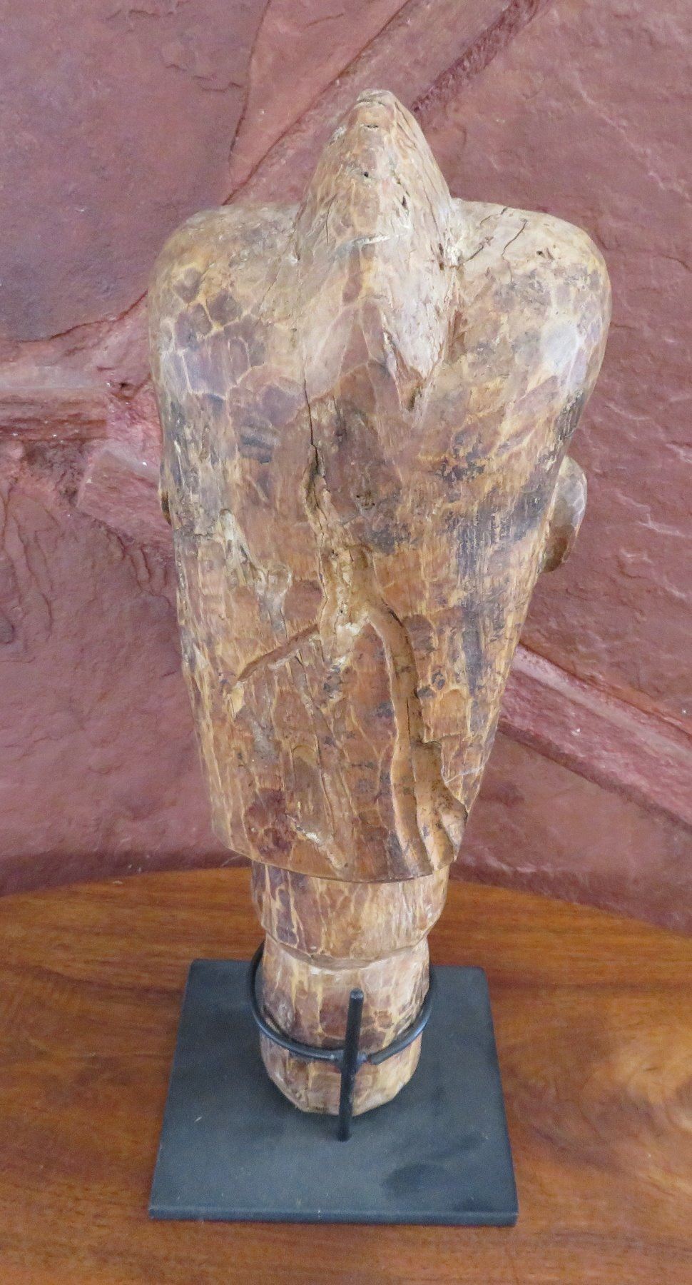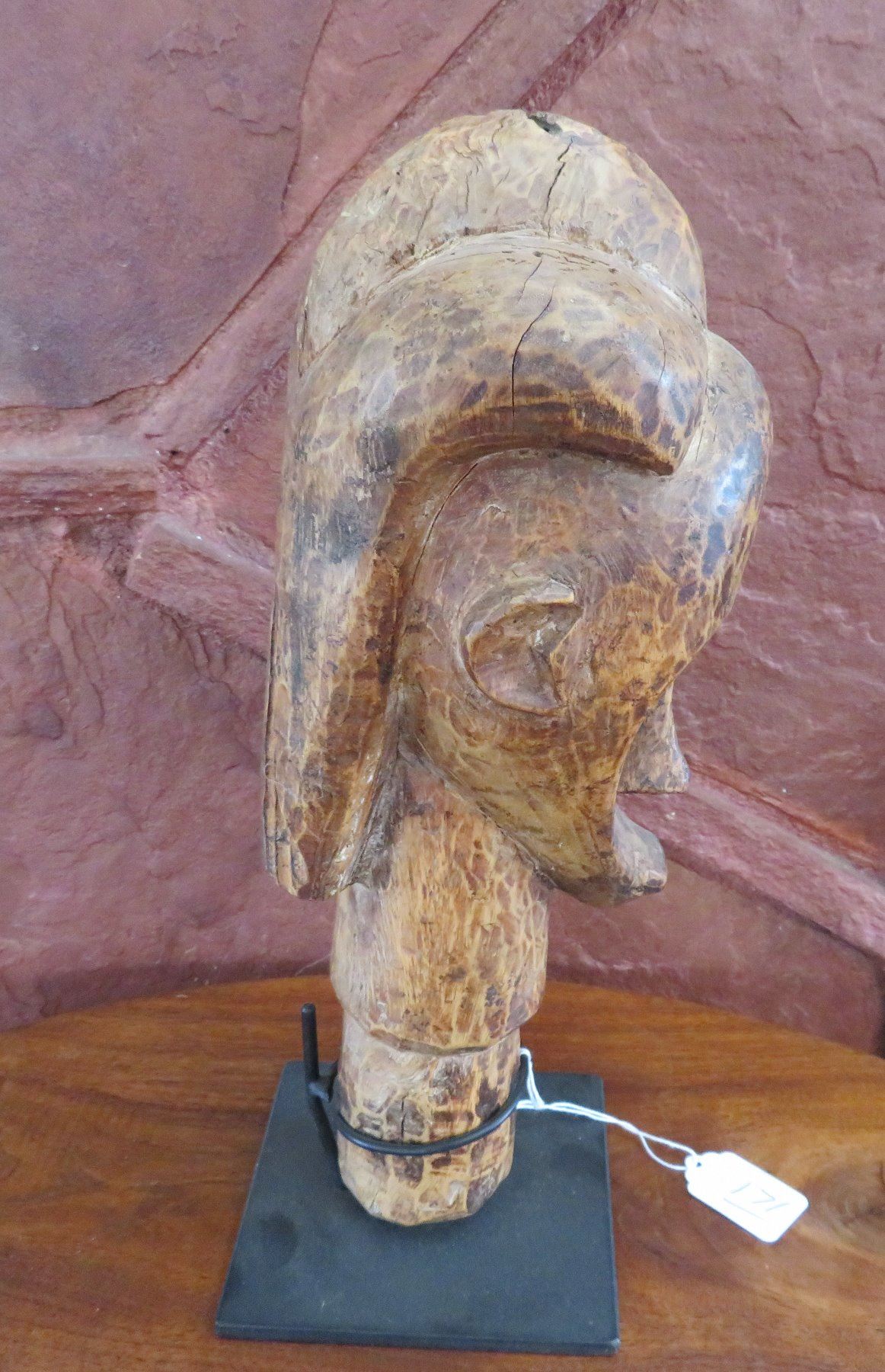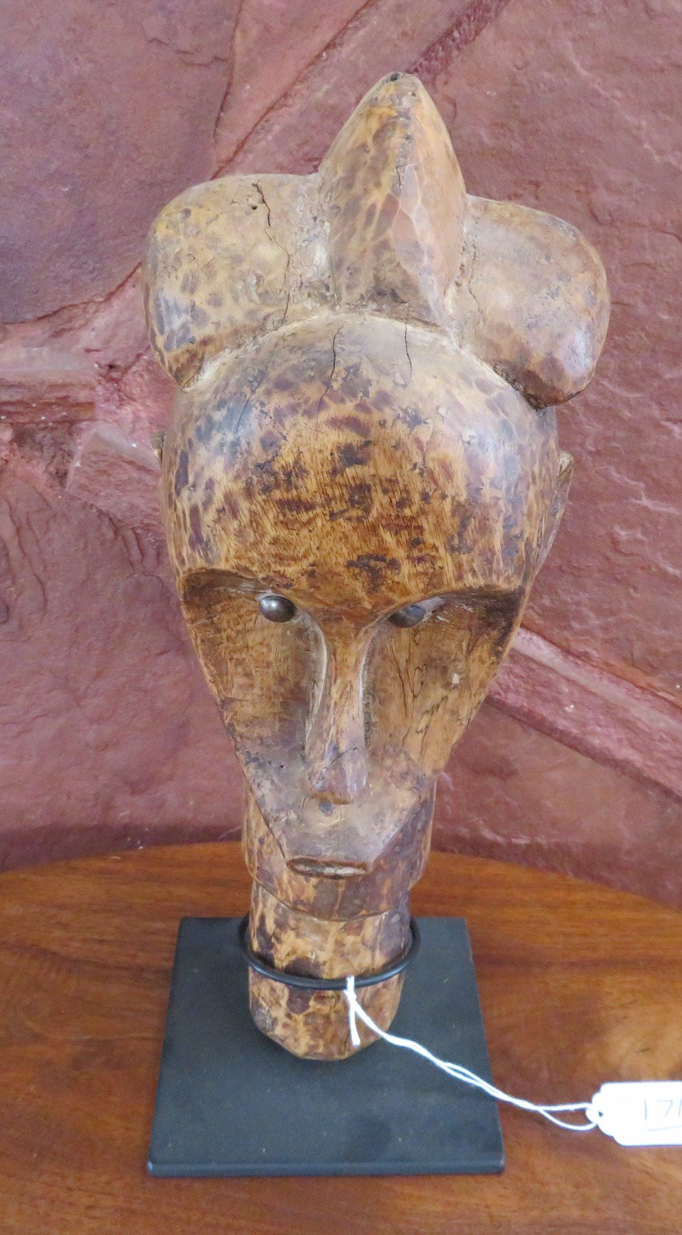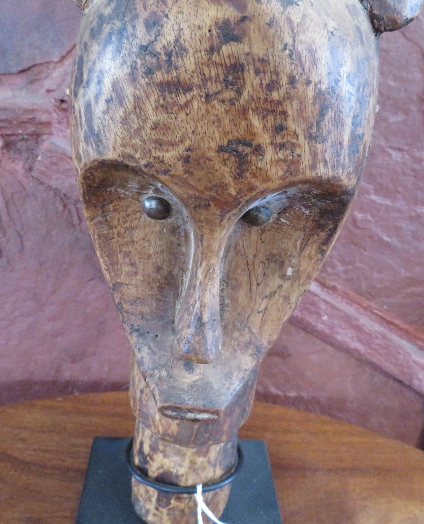 Fang Reliquary Head on Stand, early 20th century item. Made of wood and brass, the item measures 15" tall. Gabon. Condition: Termite damage, see images. Shipping: $32.50 w/insurance and signature, due to size and weight.