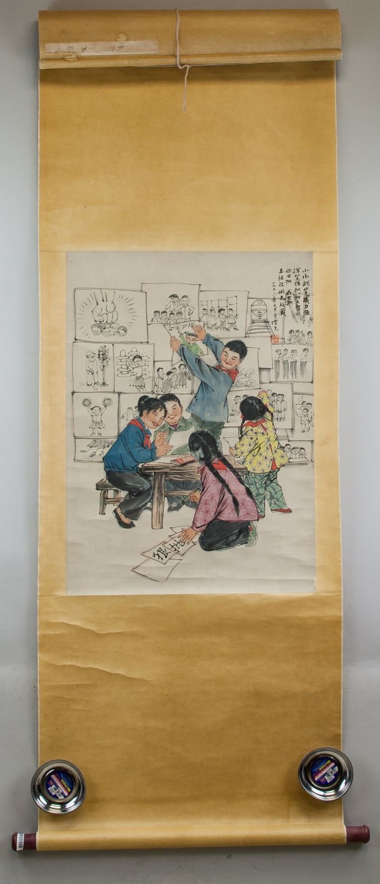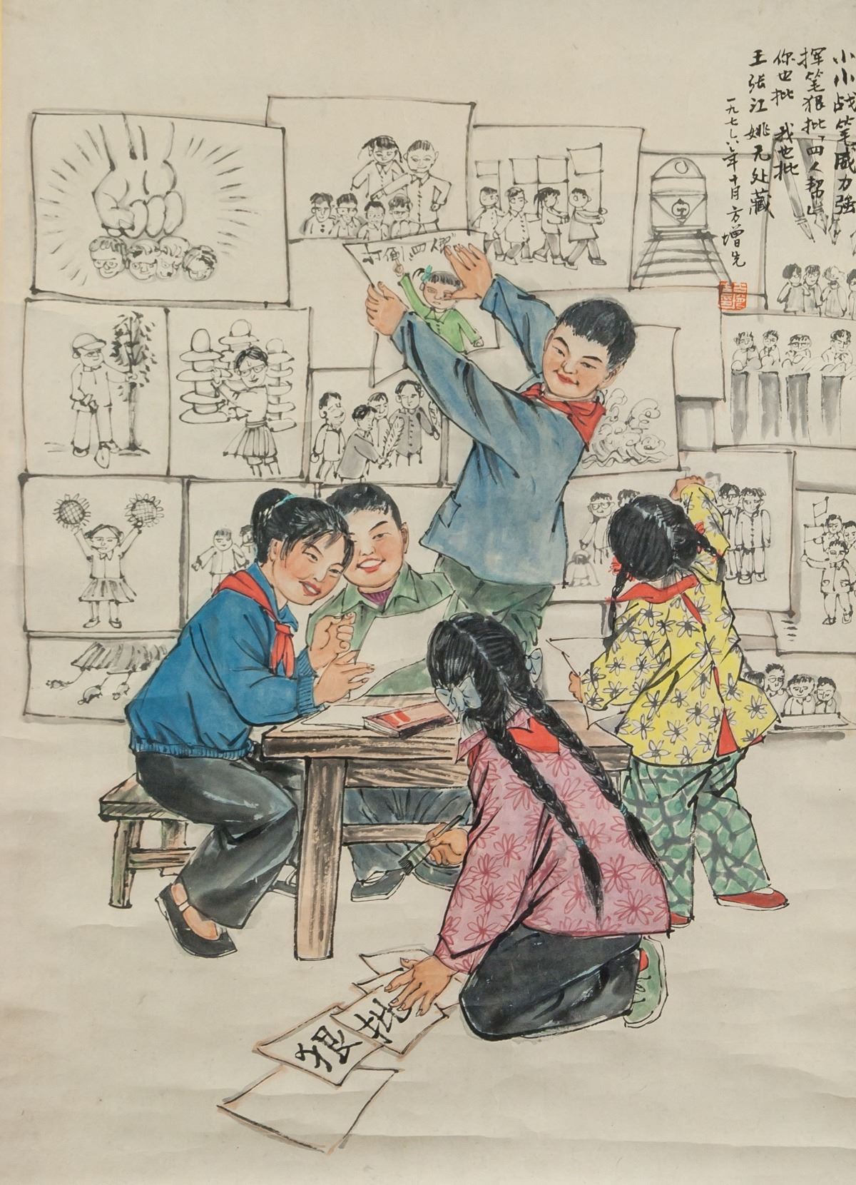 Watercolor and ink on paper, hanging scroll. Featuring class scene during Cultural Revolution. Signed Fang Zengxian b.1931 Chinese, inscribed with 1 artist seal. 68.5 x 49 cm.