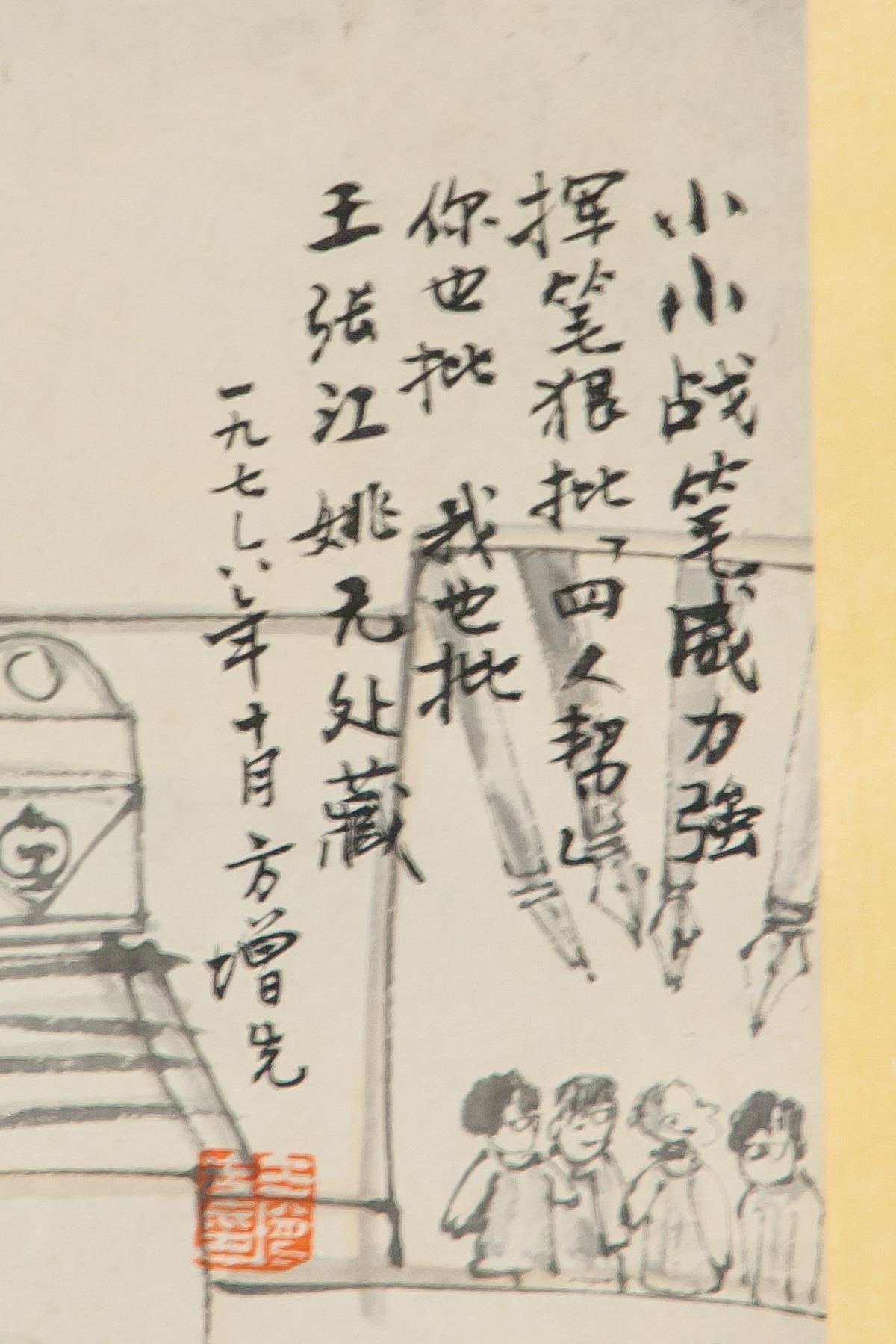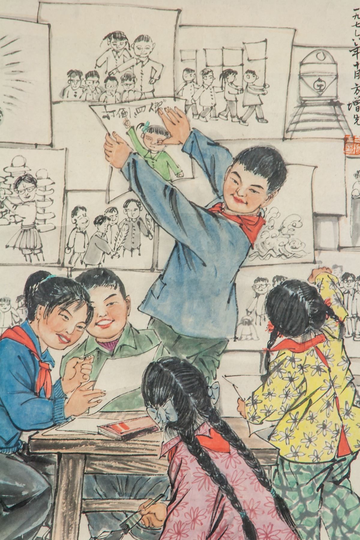 Watercolor and ink on paper, hanging scroll. Featuring class scene during Cultural Revolution. Signed Fang Zengxian b.1931 Chinese, inscribed with 1 artist seal. 68.5 x 49 cm.