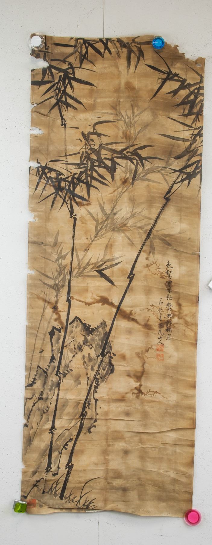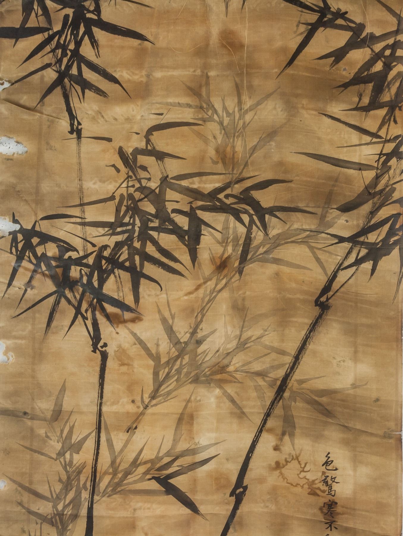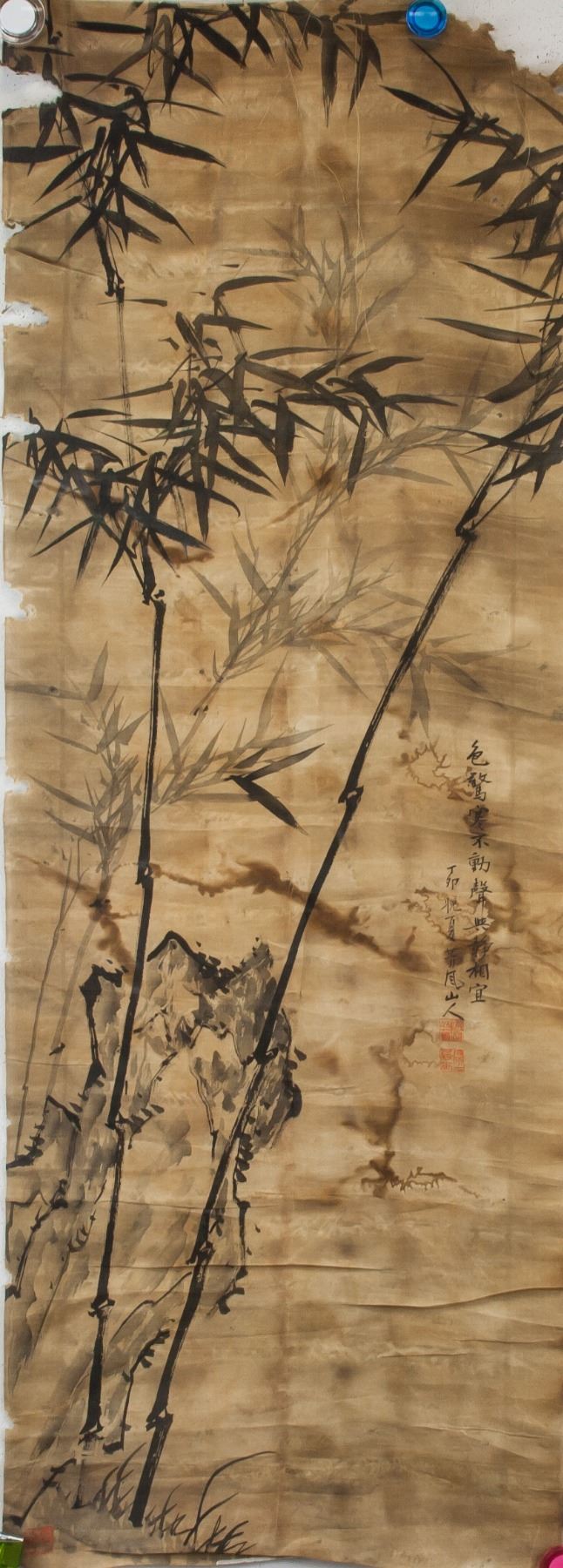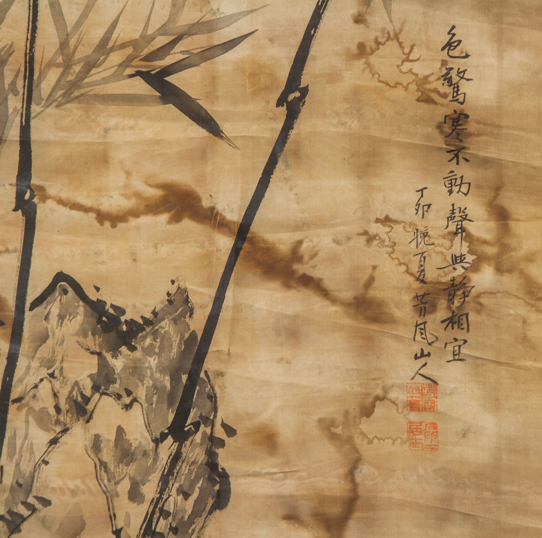 Bamboo and craggy rock; Chinese ink on silk; signed Fangfeng Shanren; inscribed with 2 artist seals; 16th/17th century; 115 cm x 42 cm