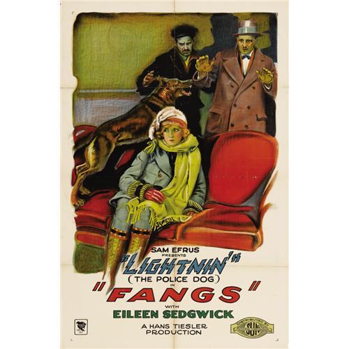 <B>Fangs (Sun Pictures, 1926).</B></I> One Sheet (27" X 41"). Lightnin' the Police Dog and Eileen Sedgwick star in this adventure thriller. This stunning stone litho one sheet has wear and chips along the edges and corners and fold wear with separations. Fine/Very Fine. <BR><BR><b>Shipping:</b> Flat Material, Small (<a target="_blank" href="http://www.heritageauctions.com/common/shipping.php">view shipping information</a>)