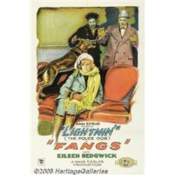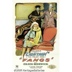 <B>Fangs (Sun Pictures, 1926)</B></I> One Sheet (27" X 41"). This gorgeous stone litho poster is believed to be an early reissue of a silent film starring serial star Eileen Sedgwick, called "Lightnin' Strikes." This Continental Litho work of art is in amazing condition for its age and has just a minor chip off of the lower left corner and some slight fold separation. Very Fine.