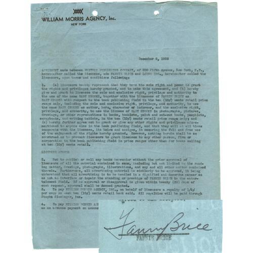 <B>Fannie Brice Signed Contract.</B></I> A three-page contract on William Morris Agency letterhead, dated December 8, 1938, and signed by Brice in black ink on the last page. The contract grants Whitman Publishing the right to use Brice's likeness in the marketing of items based on her "Little Snooks" vaudeville and radio character. In Fine condition with moderate wear and the usual staple and binder holes to the top edge.<BR><BR><b>Shipping:</b> Flat Material, Small (<a target="_blank" href="http://www.heritageauctions.com/common/shipping.php">view shipping information</a>) <BR><BR><B>Important notice:<