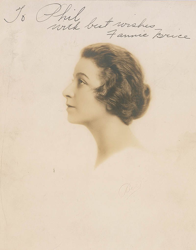 Vintage matte-finish 7.5 x 9.5 profile portrait of Brice by Bert in Kansas City, signed and inscribed in fountain pen “To Phil, with best wishes, Fannie Brice.” In very good condition, with scattered creases, light soiling, and moderate silvering.