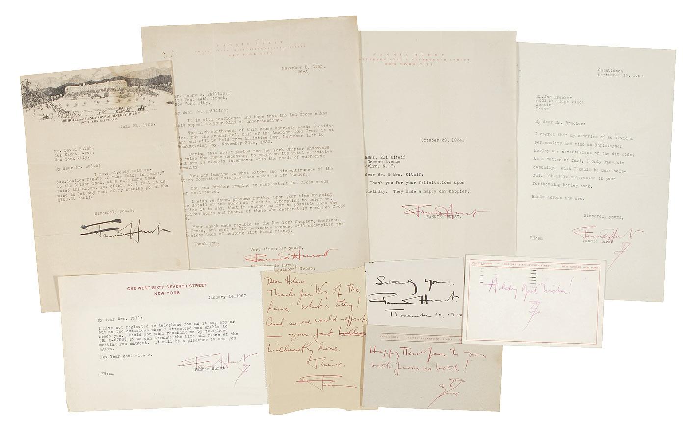 American novelist (1889–1968) best remembered for the screen adaptations of her work. Nine items: five TLSs, signed “Fannie Hurst,” dating from 1925–1967; one ALS signed “Fannie”; two note cards sending holiday greetings with her initials; and a fountain signature on an off-white card. In overall fine condition.
