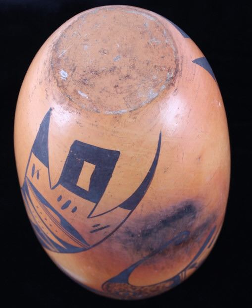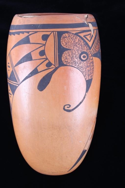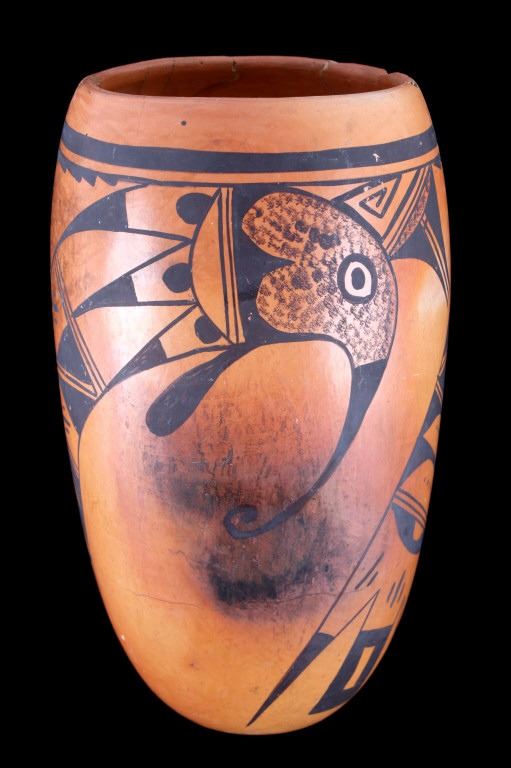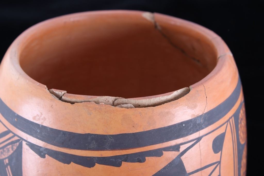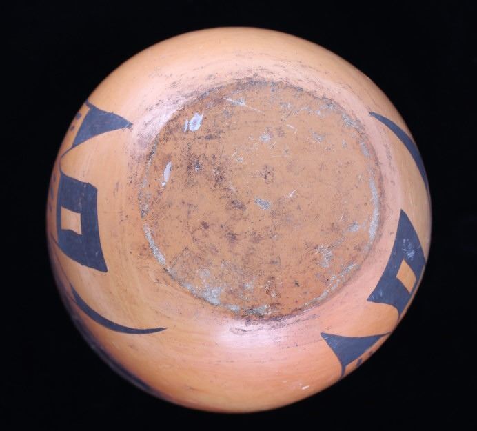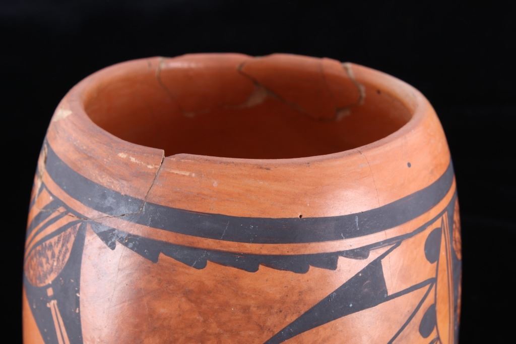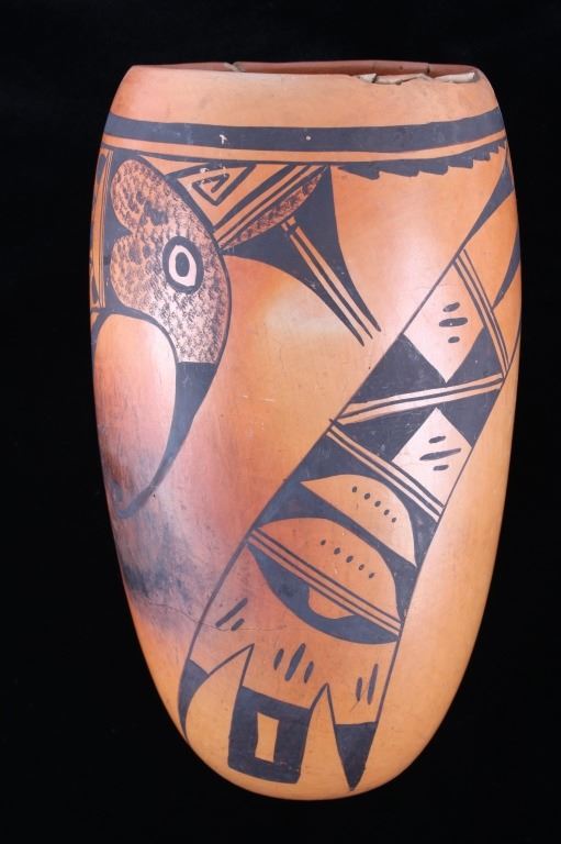 This is an original authentic Hopi Native American Indian polychrome pottery bowl attributed to Fannie Nampeyo (1900-1987). Fannie Nampeyo, also known as Fannie Lesou Polacca and Fannie Nampeyo Polacca, was an American master potter who carried on the traditions of her famous mother Nampeyo of Hano. Fannie Nampeyo was married to Vinton Polacca and was mother to Elva Nampeyo. She learned her trade from her mother one of the most renowned Hopi potters. The bowl shows a cream to red background with a black/brown traditional geometric pattern. The piece comes from a large 19th Century to early 1900’s pottery collection which includes multiple pieces from the Nampeyo family including this piece. The piece is attributed to Fannie Nampeyo and is not signed. Overall the piece shows good condition with repaired chips at the top. Overall the piece measures 9”H by 5.5”W diameter. Provenance: From a 90-year collection out of Central Arizona in the Coconino National Forest.