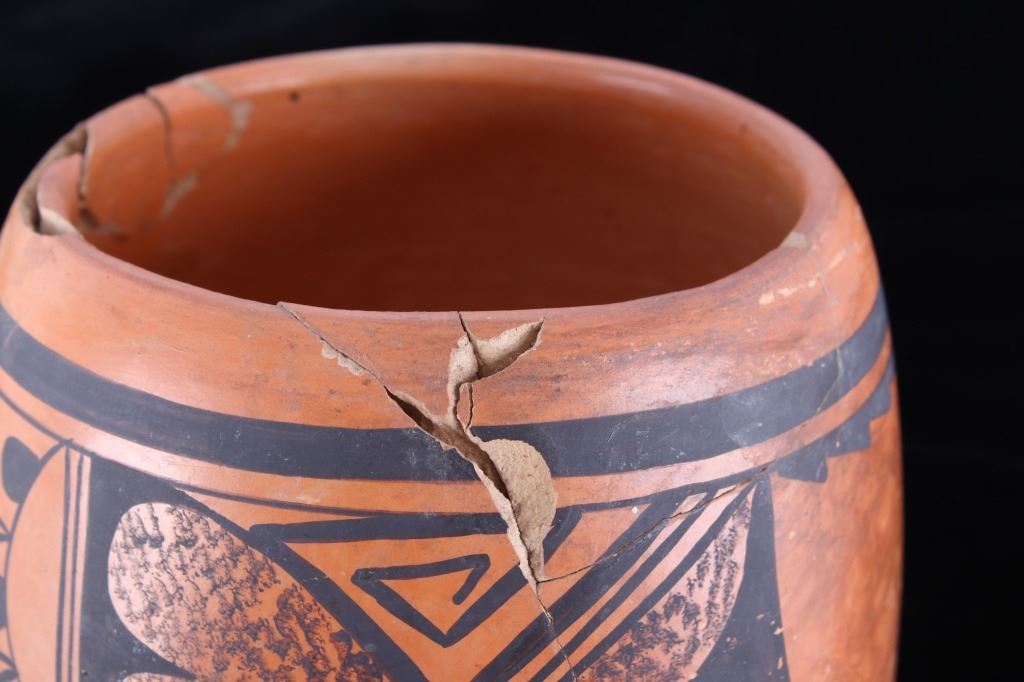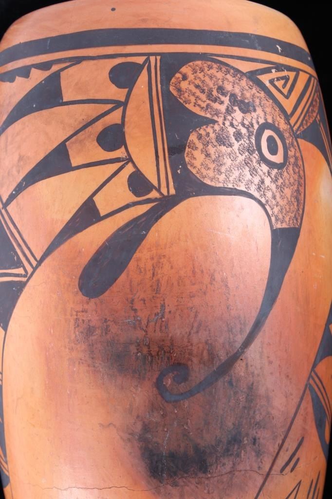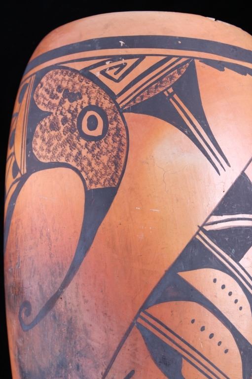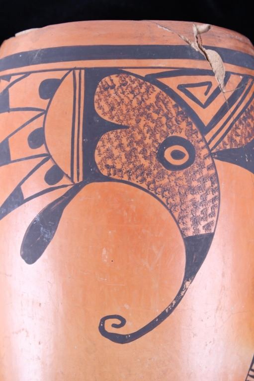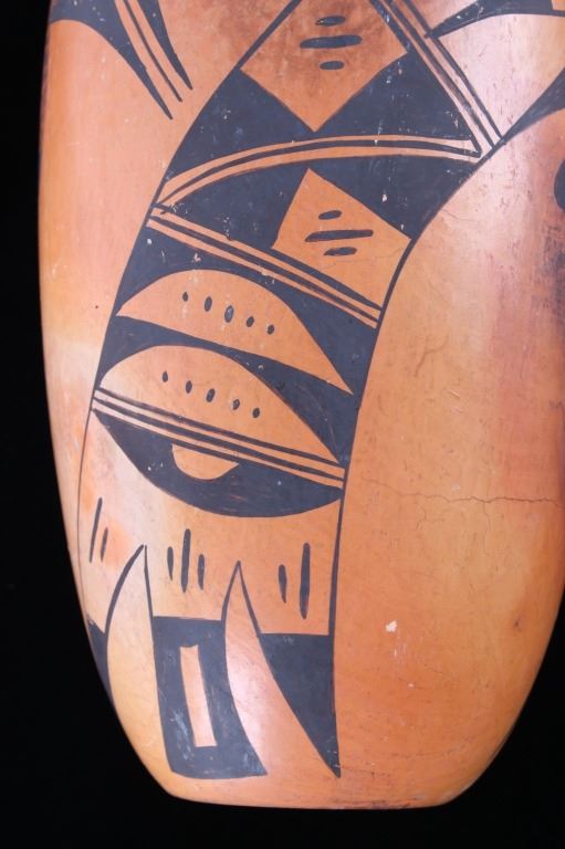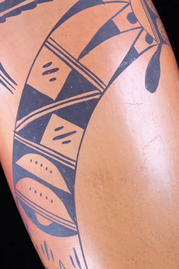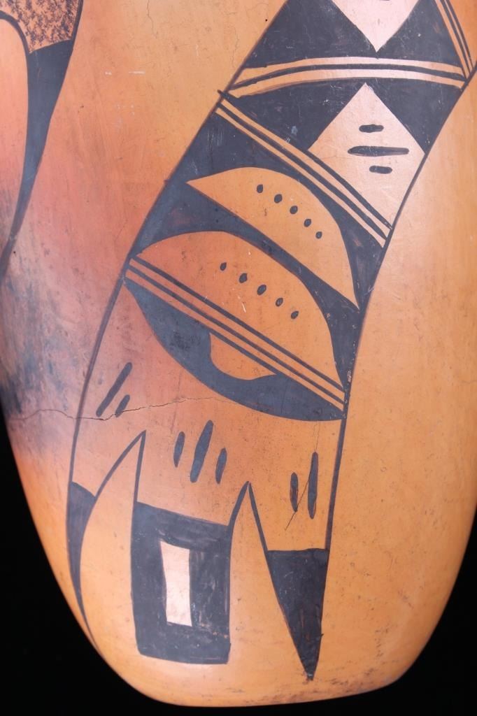 This is an original authentic Hopi Native American Indian polychrome pottery bowl attributed to Fannie Nampeyo (1900-1987). Fannie Nampeyo, also known as Fannie Lesou Polacca and Fannie Nampeyo Polacca, was an American master potter who carried on the traditions of her famous mother Nampeyo of Hano. Fannie Nampeyo was married to Vinton Polacca and was mother to Elva Nampeyo. She learned her trade from her mother one of the most renowned Hopi potters. The bowl shows a cream to red background with a black/brown traditional geometric pattern. The piece comes from a large 19th Century to early 1900’s pottery collection which includes multiple pieces from the Nampeyo family including this piece. The piece is attributed to Fannie Nampeyo and is not signed. Overall the piece shows good condition with repaired chips at the top. Overall the piece measures 9”H by 5.5”W diameter. Provenance: From a 90-year collection out of Central Arizona in the Coconino National Forest.