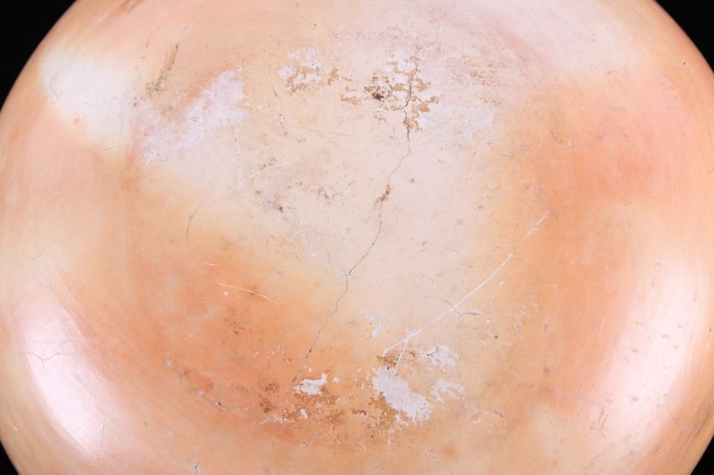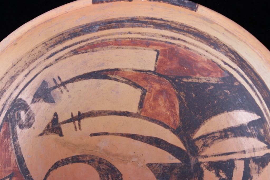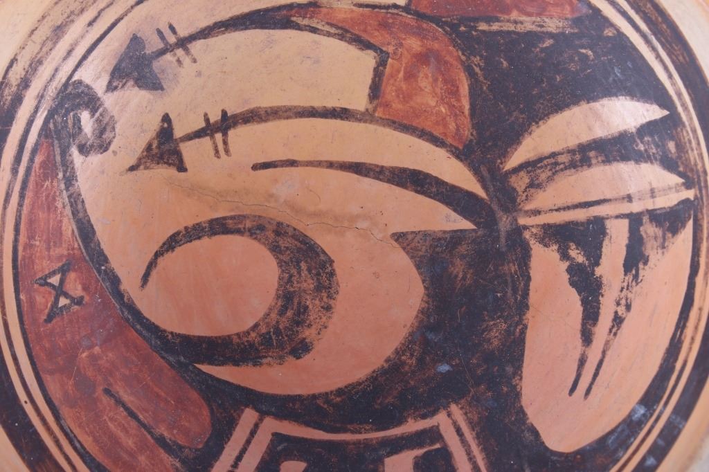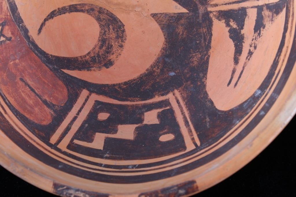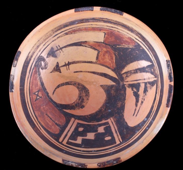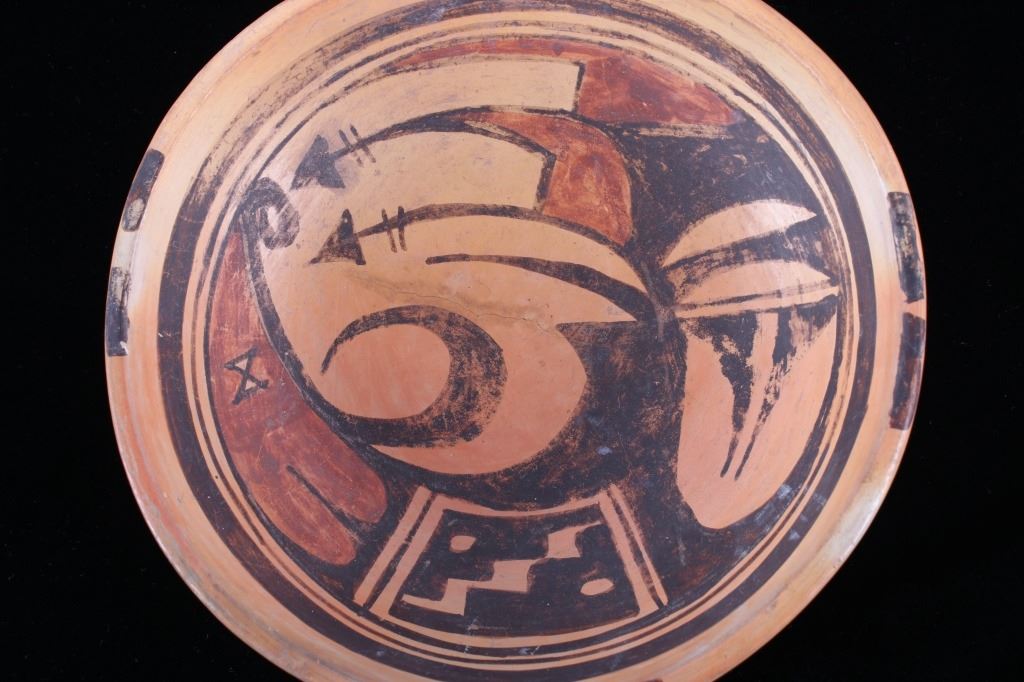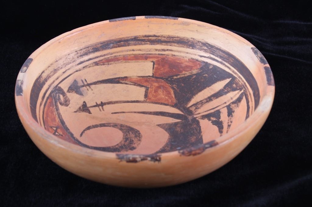 This is an original authentic Hopi Native American Indian polychrome pottery bowl attributed to Fannie Nampeyo (1900-1987). Fannie Nampeyo, also known as Fannie Lesou Polacca and Fannie Nampeyo Polacca, was an American master potter who carried on the traditions of her famous mother Nampeyo of Hano. Fannie Nampeyo was married to Vinton Polacca and was mother to Elva Nampeyo. She learned her trade from her mother one of the most renowned Hopi potters. The bowl shows a cream background with a black/brown traditional geometric pattern. The piece comes from a large 19th Century to early 1900’s pottery collection which includes multiple pieces from the Nampeyo family including this piece. The piece is attributed to Fannie Nampeyo and is not signed. Overall the piece shows very good well-preserved condition. Overall the piece measures 7 3/8” diameter by 2.25”W diameter. Provenance: From a 90-year collection out of Central Arizona in the Coconino National Forest.