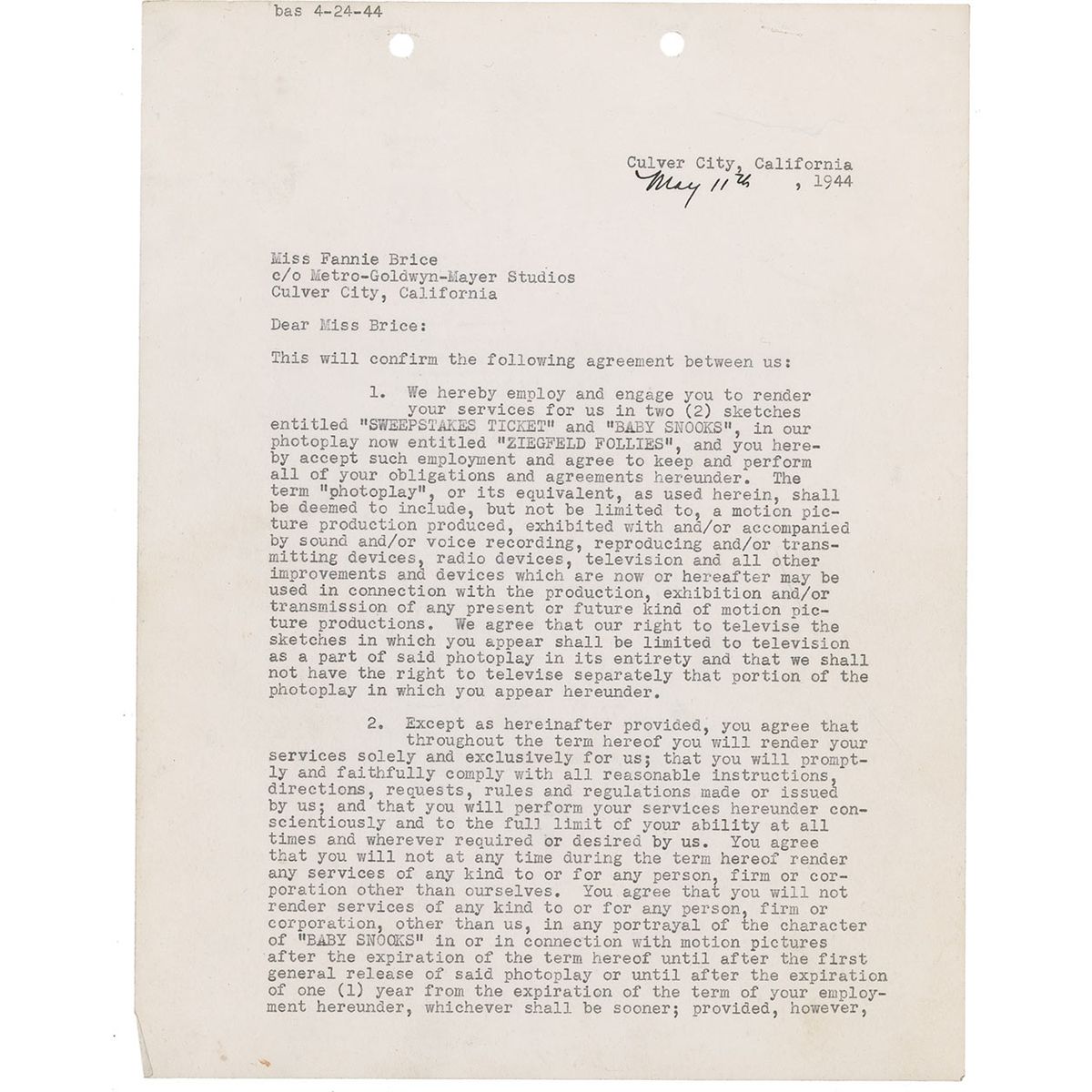 DS, eleven pages, 8.5 x 11, May 11, 1944. An agreement between Brice and Metro-Goldwyn-Mayer Studios for “two (2) sketches entitled ‘Sweepstakes Ticket’ and ‘Baby Snooks’ in our photoplay now entitled ‘Ziegfeld Follies’” for a compensation totaling $40,000 over the course of four weeks, signed by Brice on the last page. A few trivial surface creases, faint staple marks and and two binder holes along the top edge of each page, and some stray ink marks and pencil notation to signed page, otherwise fine condition.