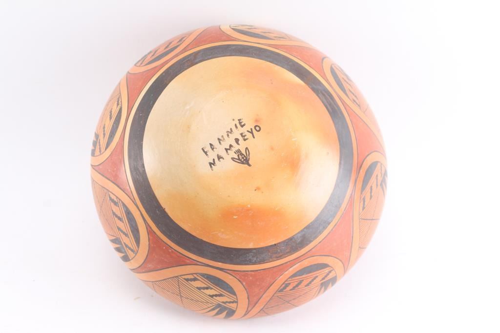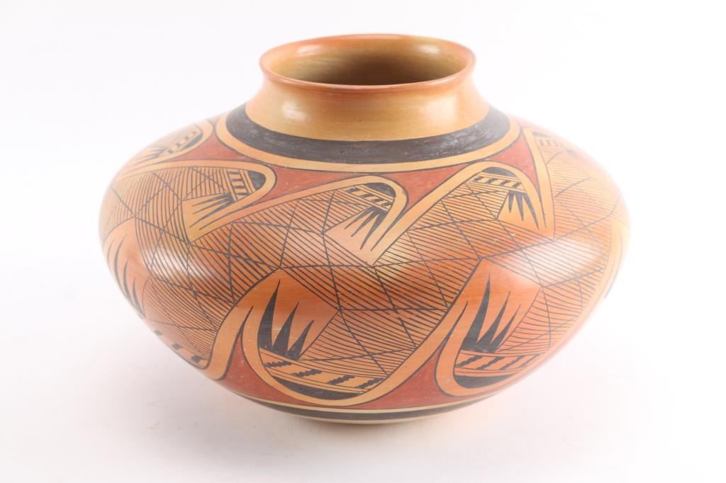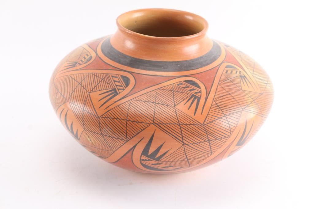Signed on base. With a geometric painted design. In overall good condition. 14x8" approximately.