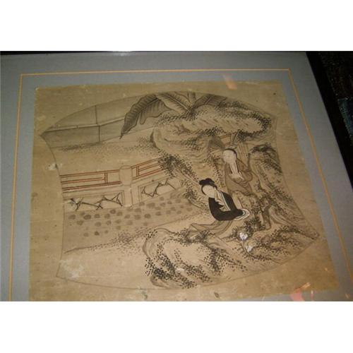 Original Painting for a fan in a wooden frame with glass from around 1900. probably chinese, and representing a man and a woman in a garden.