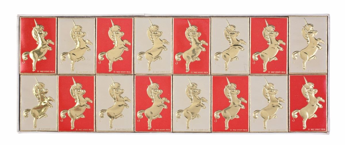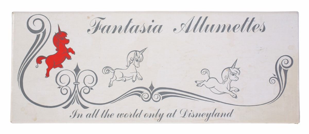 (Disneyland, 1960s) Boxed set of (16) miniature balsa wood match boxes labeled, "Fantasia Allumettes". Sold at the Tobacco Shop on Main Street. Outer box measures 3.5"x9". Set is in good condition, unused, with some discoloration to aspects of the outer box.