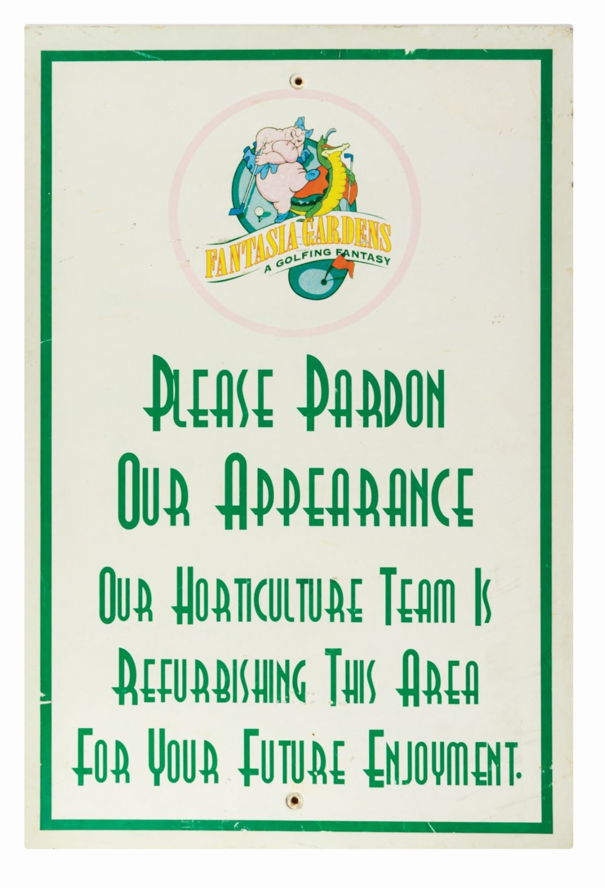 (Walt Disney World, 2001) An original sign from the Fantasia Gardens golf course at the Walt Disney World Resort. The sign features the logo for the golf course with a message that the horticulture team is refurbishing the area. Printed on compact foam board, the sign measures 18"x12" and is in fair to good condition with some surface scratches and general wear throughout. The reverse has a hand-written personalized note dating the sign to 2001 when it was given as a gift.