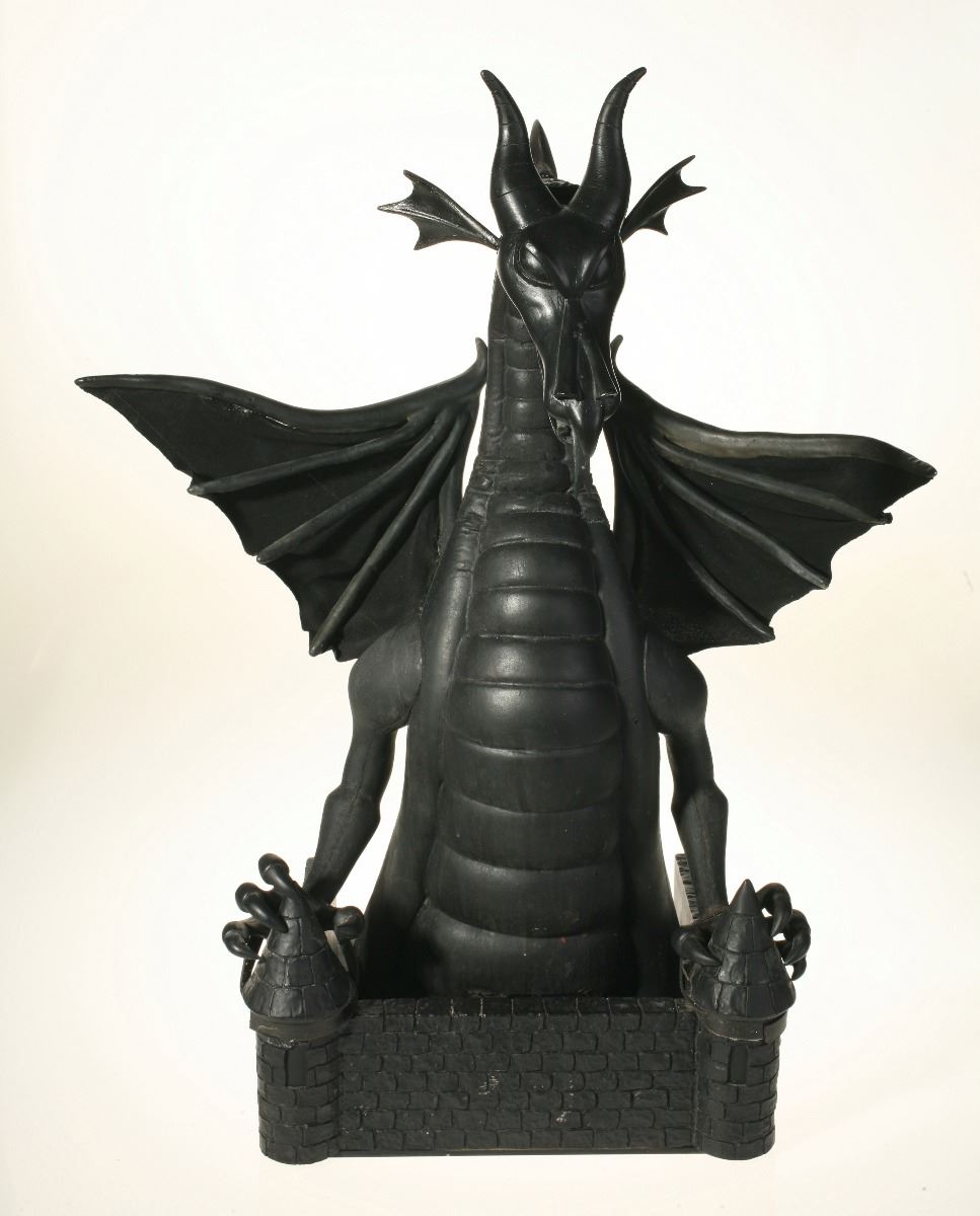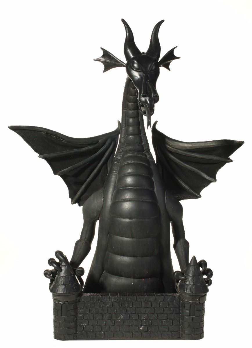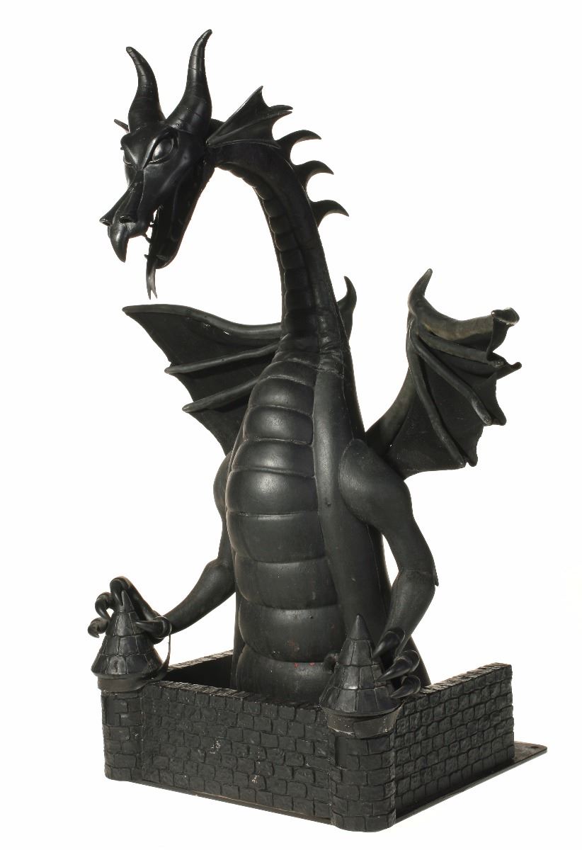 (Disneyland, 2008) Impressive articulated maquette for the "Fantasmic!" attraction at Disneyland. Opening in 1992 at the "Rivers of America" in New Orleans Square, the attraction originally featured Mickey battling Maleficent as a dragon consisting of only the head and neck of the creature. In 2008, during a refurbishment of the attraction, it was changed to a full-figure animatronic dragon over 40 feet tall. This original model for the dragon, sculpted by Ray Brown, is made of hand-painted foam over a metal frame. The neck and head are fully articulated. The entire piece measures 12"x12" and 28" tall. In very good condition.