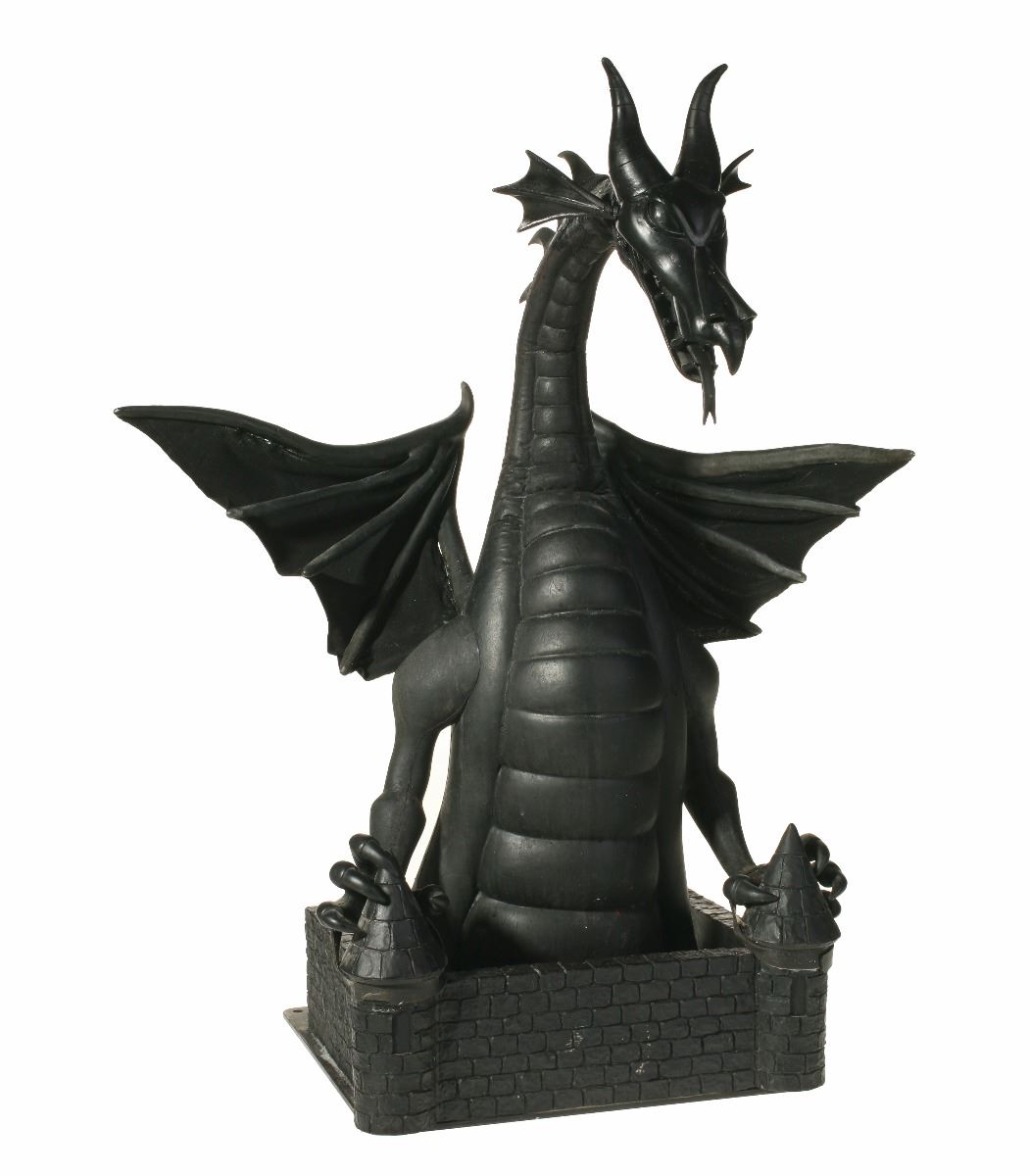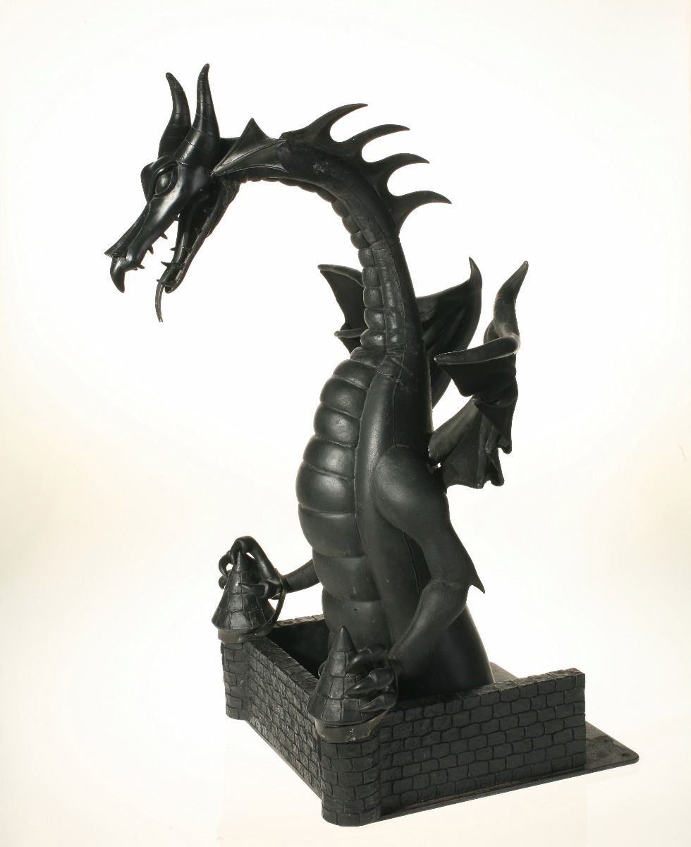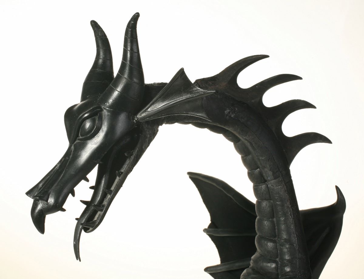 (Disneyland, 2008) Impressive articulated maquette for the "Fantasmic!" attraction at Disneyland. Opening in 1992 at the "Rivers of America" in New Orleans Square, the attraction originally featured Mickey battling Maleficent as a dragon consisting of only the head and neck of the creature. In 2008, during a refurbishment of the attraction, it was changed to a full-figure animatronic dragon over 40 feet tall. This original model for the dragon, sculpted by Ray Brown, is made of hand-painted foam over a metal frame. The neck and head are fully articulated. The entire piece measures 12"x12" and 28" tall. In very good condition.