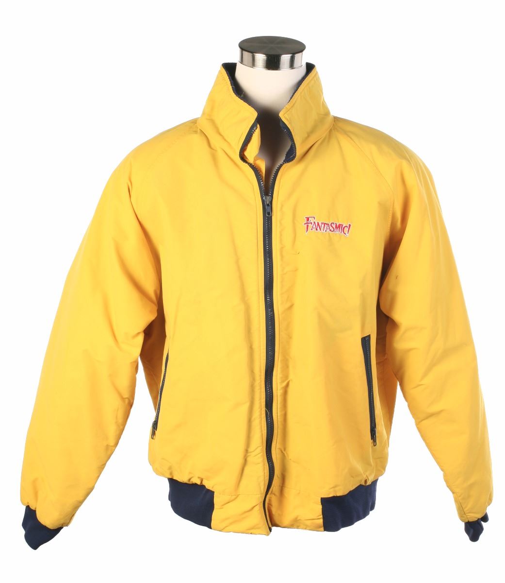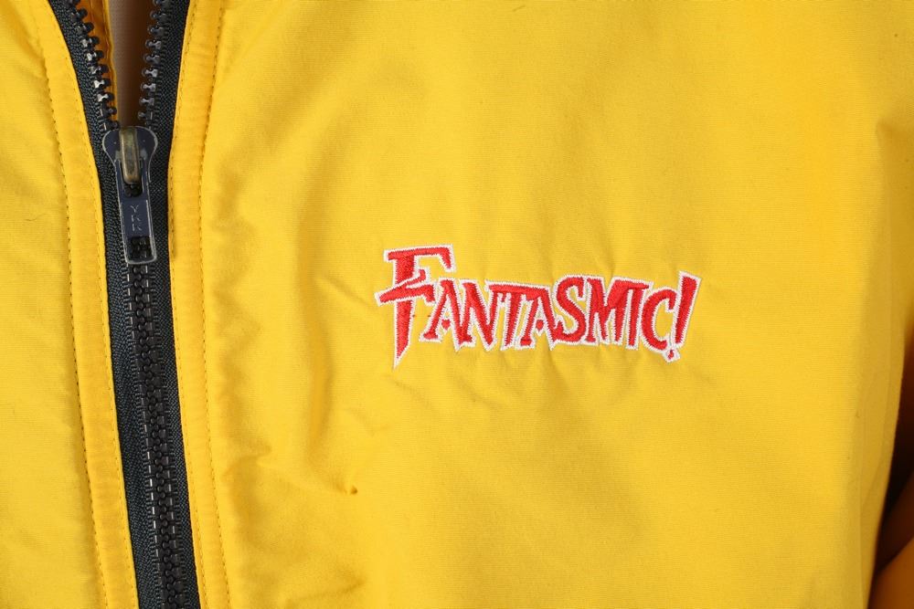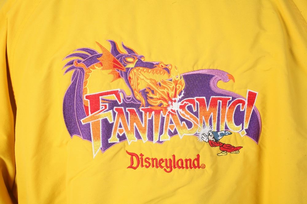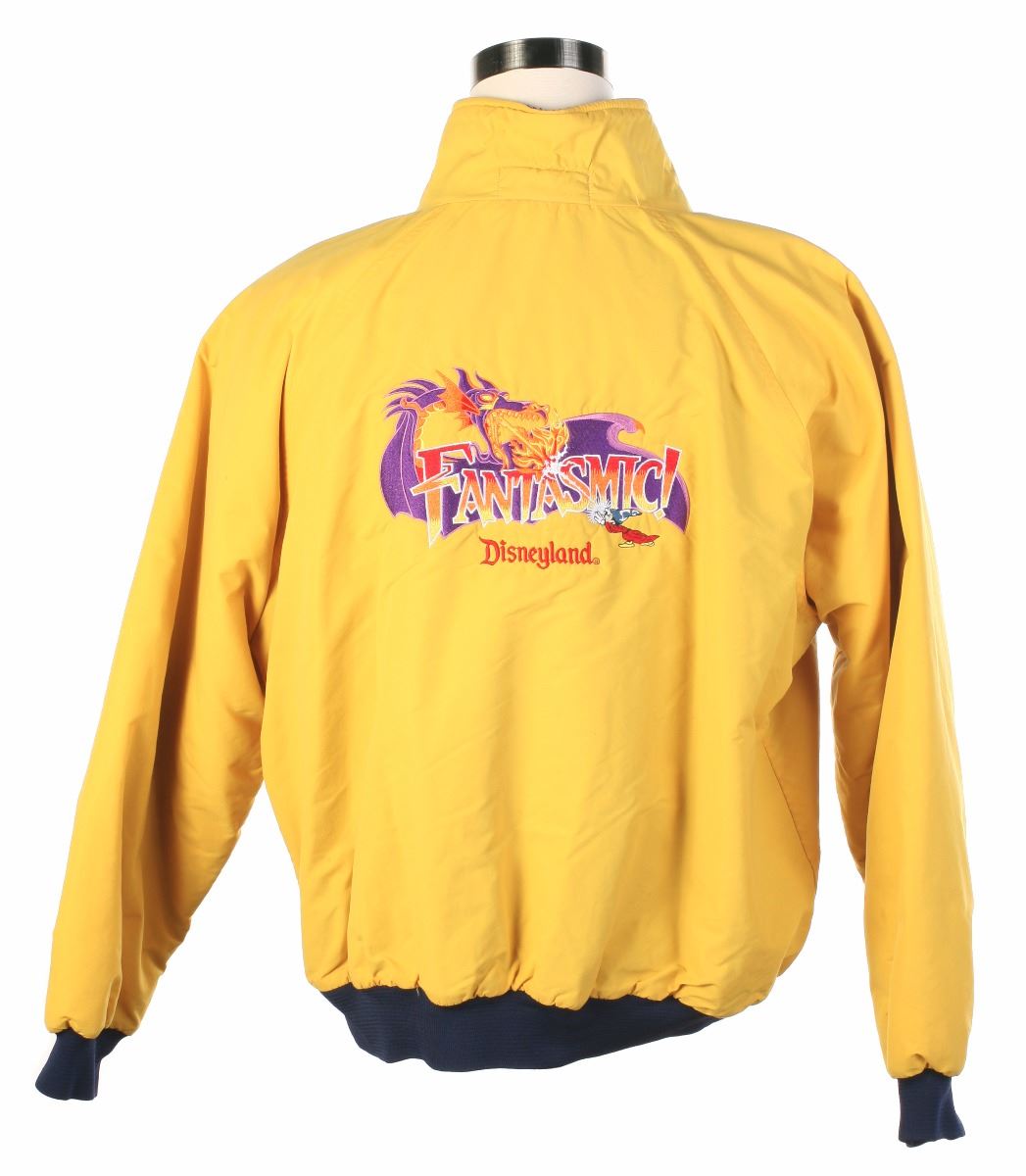 (Disneyland, 1990s) Rare yellow cast member jacket from the "Fantasmic!" attraction for cast members who would be on-stage. This jacket reads "Fantasmic!" on the chest with "Fantasmic - Disneyland" embroidered on the back. Size Medium. In very good condition. The original owner's name is written in felt marker on the insider collar.