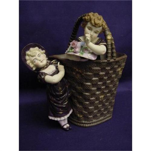 Fantastic 10in Kate Greenway German Bisque Figure, Excellent. This wonderful piece is large measuring 10in tall X 9in wide X 8in long. 2 beautiful children in their period costumes stand in a porcelain bisque basket.This piece is in excellent condition with no damages, hairlines, or repairs. Absolutely a heirloom to cherish!