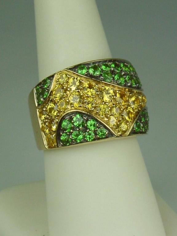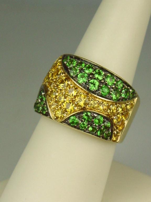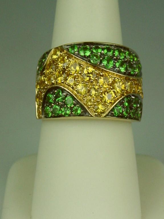 Fantastic 18 karat yellow gold custom made ring weighing over 16 grams signed and ‘Made in Italy’ pave set with over 70 very fine green Tsavorite garnets and orange sapphires weighing approx. 5.00 carats. Retail$3,000-$5,000