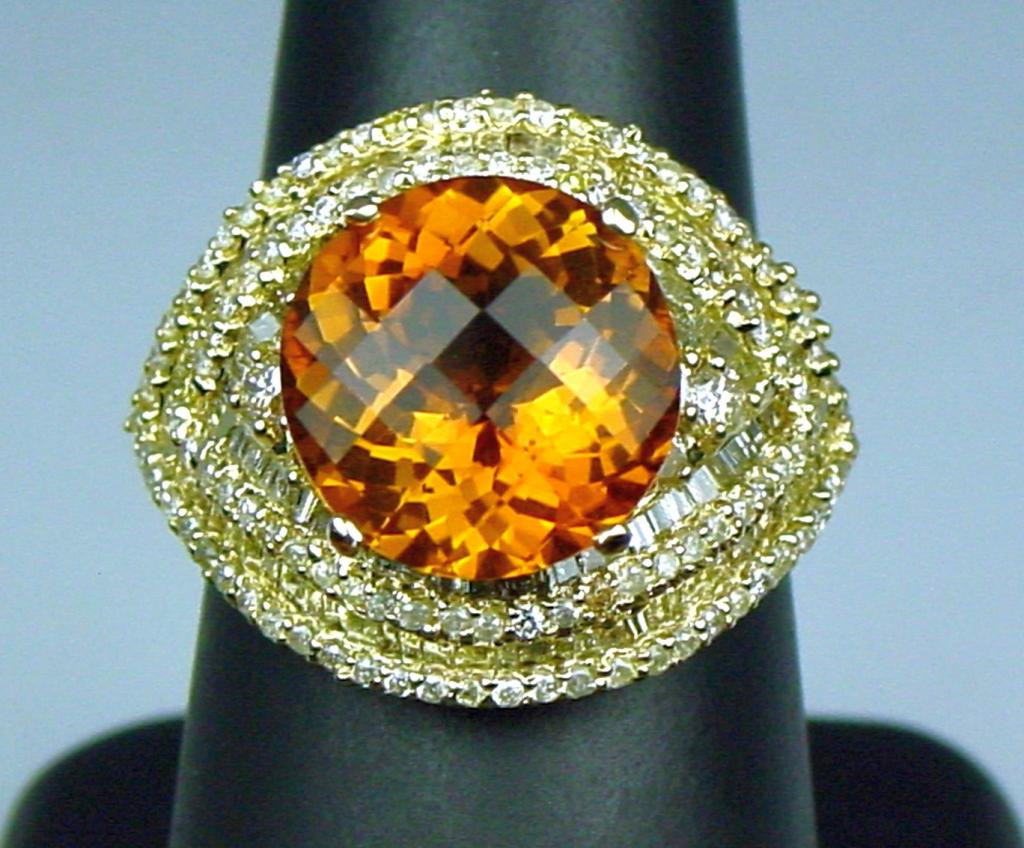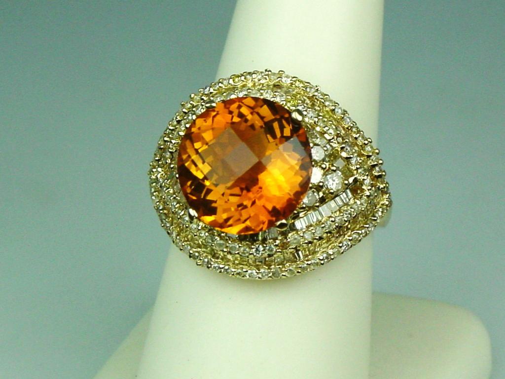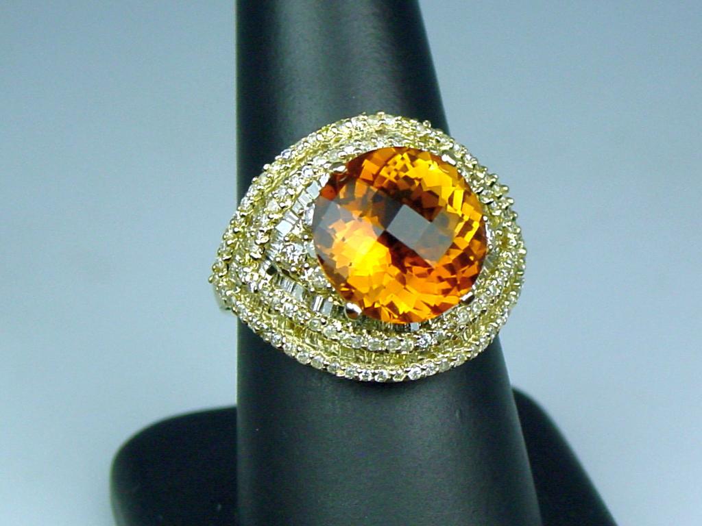 Fantastic 18 karat yellow gold ladies custom  made ring set with a custom cut Orange  Citrine weighing over 5.00 carats and fine  set with over 270 round and baguette cut  diamonds weighing approx. 3.50-4.00 carats of H-I colors and SI/I clarity. Retail  $4,950.00 Estimate $1,200-$2,000 Over $1,000  labor to set diamonds