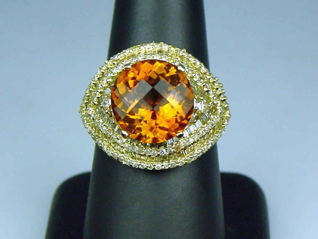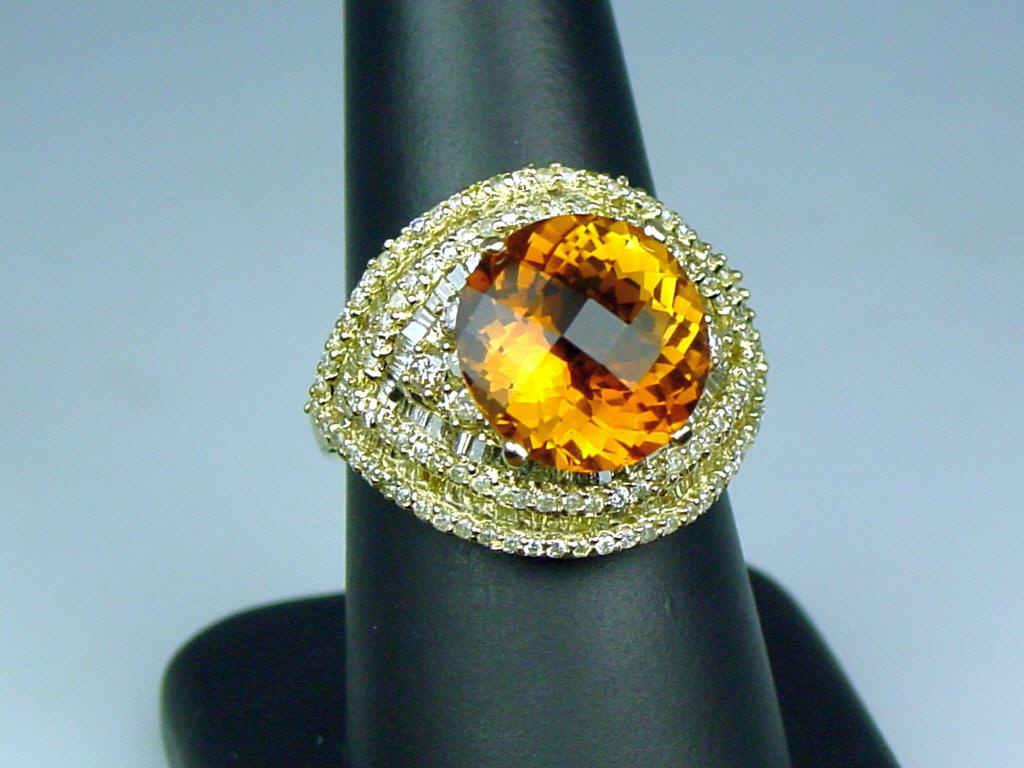 Fantastic 18K YG Ladies Custom Made Ring Set with a very large custom cut Madeira Orange Citrine weighing over 5.00 carats and fine set with over 270 round and baguette cut diamonds weighing approx. 3.50-4.00 carats of H-I colors and SI/I clarity. RetailSet with a very large custom cut Madeira Orange Citrine weighing over 5.00 carats and fine set with over 270 round and baguette cut diamonds weighing approx. 3.50-4.00 carats of H-I colors and SI/I clarity. Retail $4,950.00
