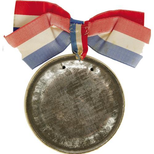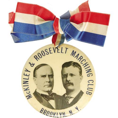 <B>Fantastic 4" McKinley & Roosevelt Jugate Button from Brooklyn, New York.</B></I> Clearly the stylistic "mate" to the Houston Bryan & Stevenson version offered elsewhere in this auction, but in this case in gorgeous condition, even with the original red, white, and blue ribbon bow from which it is suspended. A case might be made for the massive 10" jugate, but to our taste this has to be considered the PREMIER McKinley & Roosevelt jugate variety. We cannot recall seeing another offered. <I>From the Norman Loewenstern Collection.</B></I>