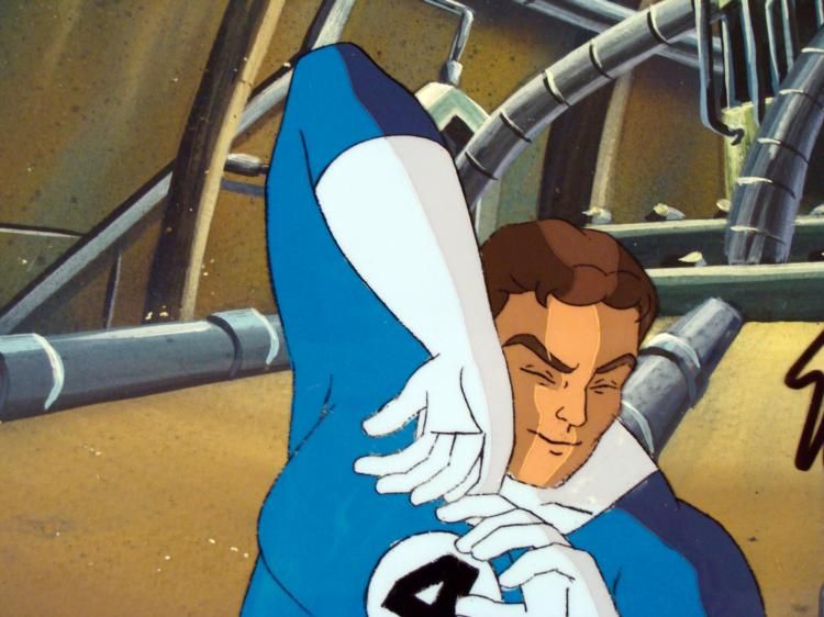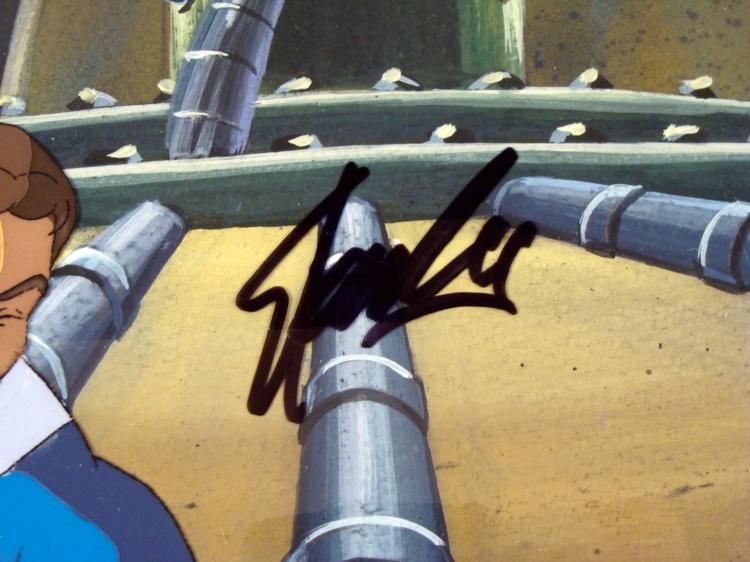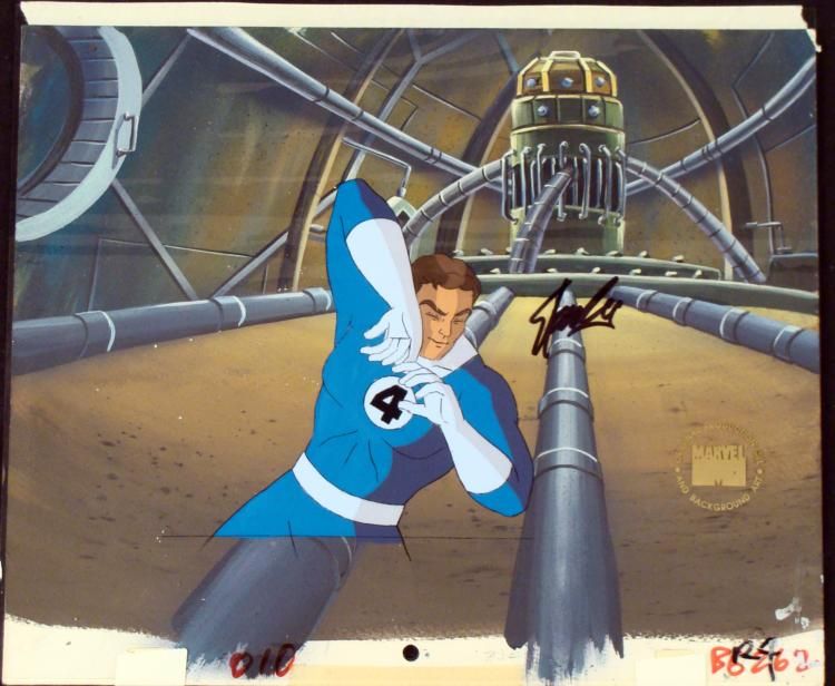 This is an original signed production cel and background from the hit series Fantastic 4. Stan Lee signature is located on the right side of cel in black sharpie. * * Mr. Fantastic is a boss * * * * * Original Animated Cel & Production BackgroundMedium: Hand-painted acetate cel * * Detail: Numbered at bottom and pegs * * Overall Size of the Cel: 10 1/2" x 12 1/2" * Overall Size of the background: 10 1/2" x 12 1/2" * Condition: Very good * * * Each one-of-a-kind set-up represents a slight change in position of the characters. When individually photographed and projected in rapid succession, the images appear to move. * * To create production cels, the original animator's drawing is transferred onto an acetate cel (by hand-inking and/or photo copying). The cel is then hand-painted on the reverse side. The background accompanying this set-up is an original production background. * * * The cel and original background is ready to be matted and framed. The animators notations are located at the top of the cel and background. The Marvel Seal is located at the bottom right of the cel. * * * *