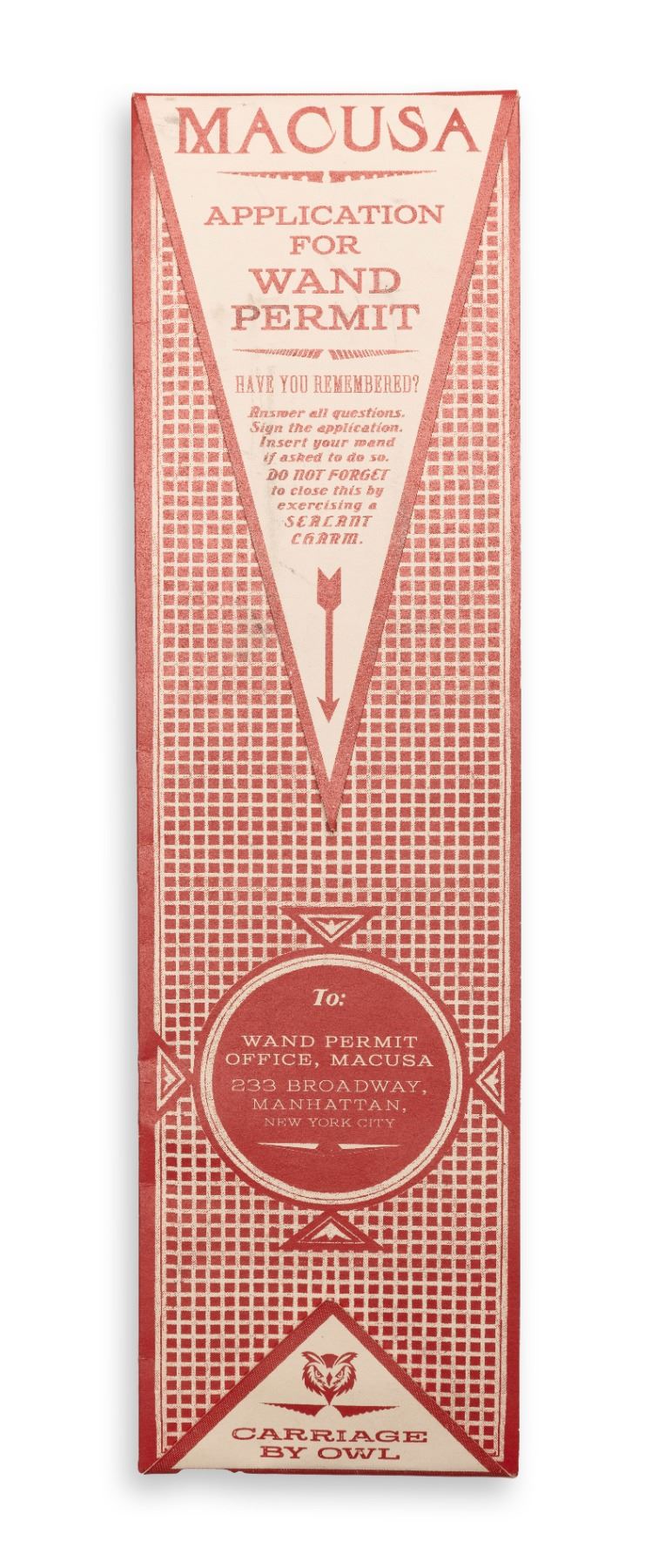 Original wand permit paperwork featured in the production of the 2016 fantasy film Fantastic Beasts and Where to Find Them. The year is 1926, and Newt Scamander (Eddie Redmayne) has just completed a global excursion to find and document an extraordinary array of magical creatures. Arriving in New York for a brief stopover, he might have come and gone without incident, were it not for a No-Maj (American for Muggle) named Jacob, a misplaced magical case, and the escape of some of Newt's fantastic beasts, which could spell trouble for both the wizarding and No-Maj worlds.