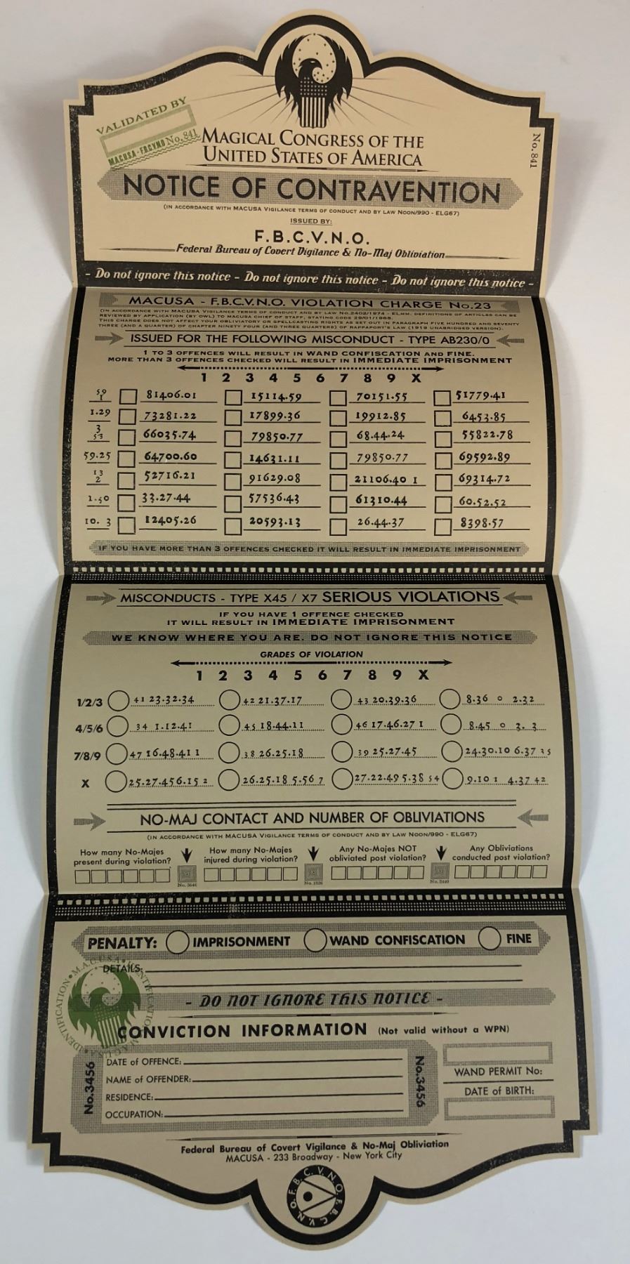 Original "Notice Of Contravention" form from the Magical Congress of the United States of America, from the fantasy film "Fantastic Beasts and Where to Find Them" (2016), the spin-off and prequel to the Harry Potter film series, the adventures of writer Newt Scamander in New York's secret community of witches and wizards seventy years before Harry Potter reads his book in school. The film features an ensemble cast that includes Eddie Redmayne, Katherine Waterston, Dan Fogler, Alison Sudol, Ezra Miller, Samantha Morton, Jon Voight, Carmen Ejogo, and Colin Farrell.