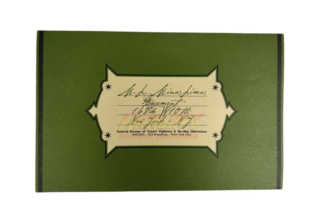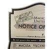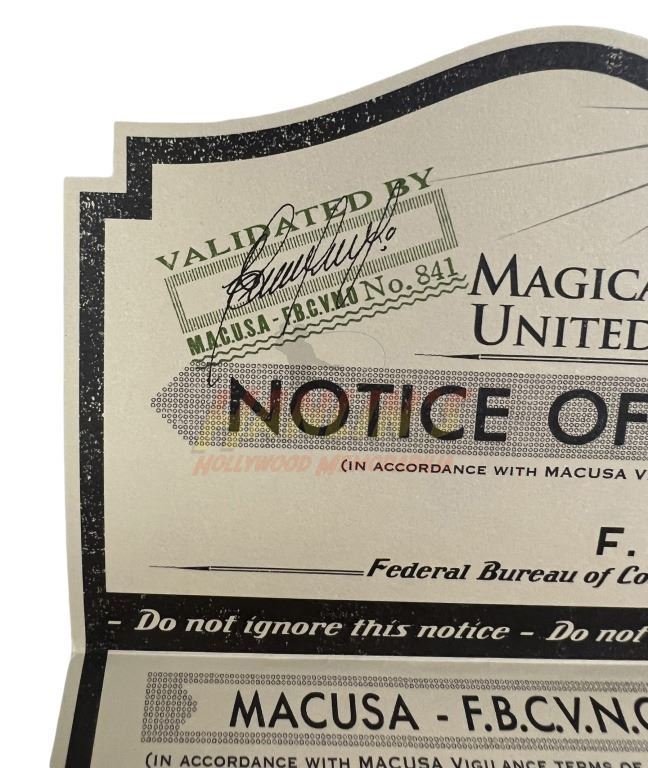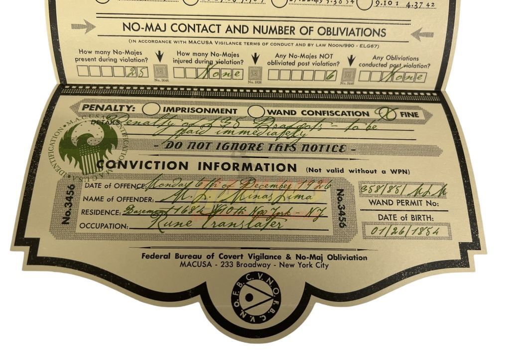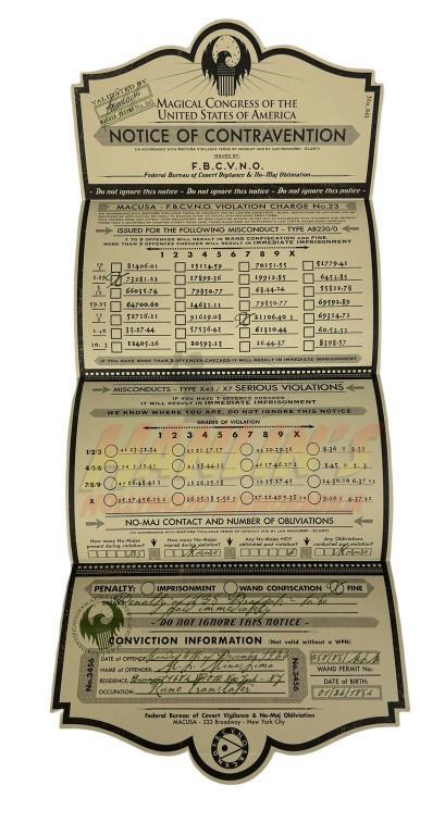 Original Magical Congress of the USA "Notice Of Contravention" form from the Magical Congress of the United States of America, from the fantasy film 'Fantastic Beasts and Where to Find Them' (2016), the spin-off and prequel to the Harry Potter film series, the adventures of writer Newt Scamander in New York's secret community of witches and wizards seventy years before Harry Potter reads his book in school.