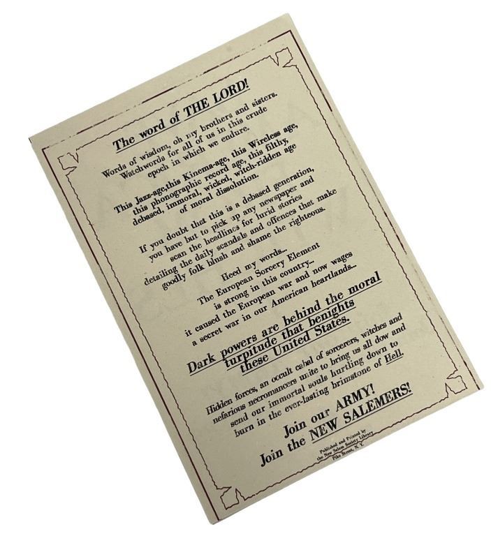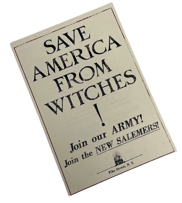 Original "Save America From Witches!" flyer from the fantasy film 'Fantastic Beasts and Where to Find Them' (2016), the spin-off and prequel to the Harry Potter film series, the adventures of writer Newt Scamander in New York's secret community of witches and wizards seventy years before Harry Potter reads his book in school.