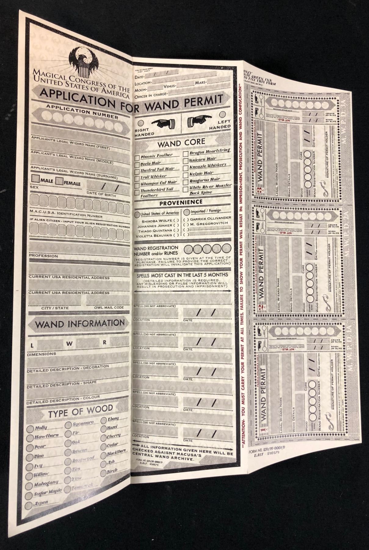 Original green "Wand Permit Application" from the Magical Congress of the United States of America, from the fantasy film "Fantastic Beasts and Where to Find Them" (2016), the spin-off and prequel to the Harry Potter film series, the adventures of writer Newt Scamander in New York's secret community of witches and wizards seventy years before Harry Potter reads his book in school. The film features an ensemble cast that includes Eddie Redmayne, Katherine Waterston, Dan Fogler, Alison Sudol, Ezra Miller, Samantha Morton, Jon Voight, Carmen Ejogo, and Colin Farrell.