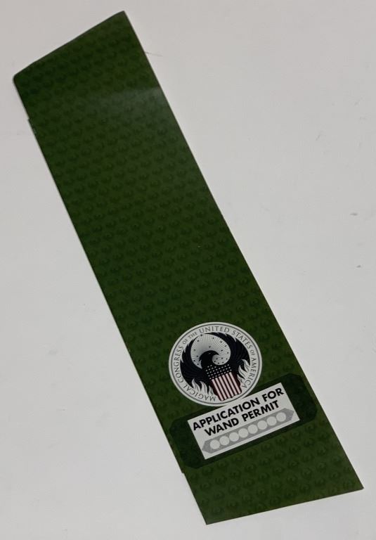 Original green "Wand Permit Application" from the Magical Congress of the United States of America, from the fantasy film 'Fantastic Beasts and Where to Find Them' (2016), the spin-off and prequel to the Harry Potter film series, the adventures of writer Newt Scamander in New York's secret community of witches and wizards seventy years before Harry Potter reads his book in school.