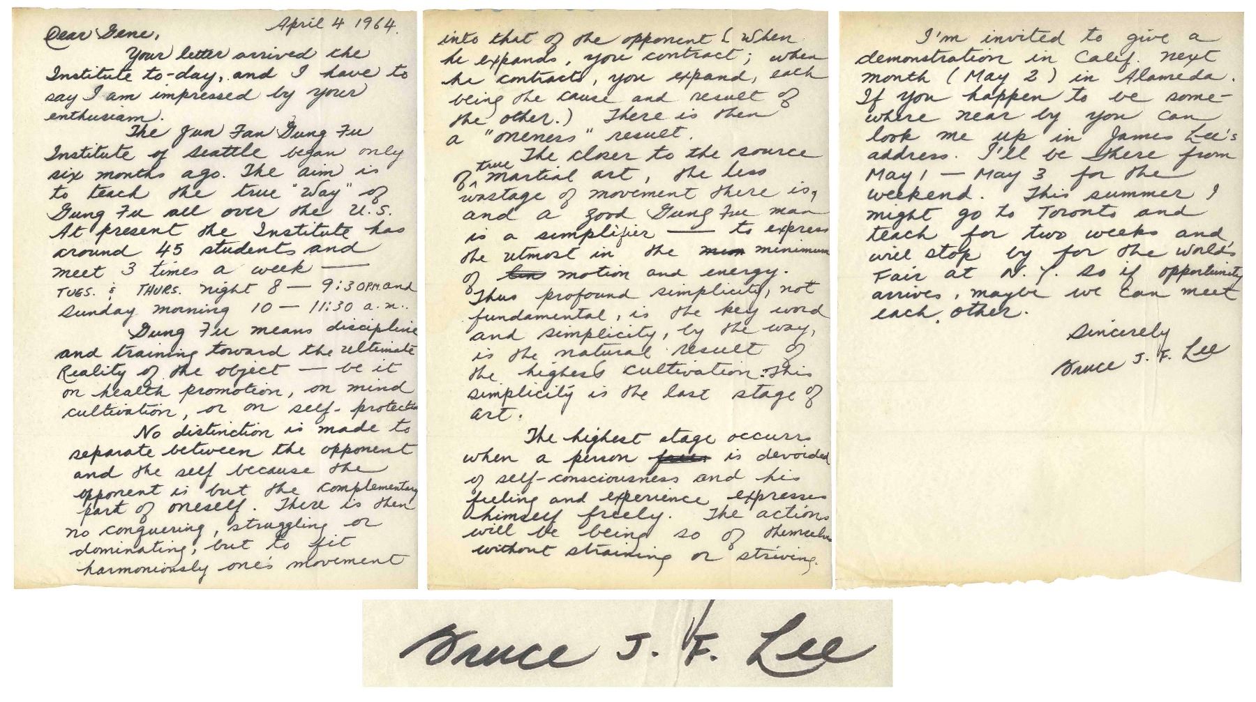 Bruce Lee autograph letter signed, with exceptional content explaining the philosophical and spiritual underpinnings of Gung Fu martial arts, simply the best Bruce Lee letter ever to appear on the market. Dated 4 April 1964 with the original envelope postmarked from Seattle, Lee writes to an aspiring martial arts student Gene Snelling, just before Snelling deployed to Vietnam. The inspiring letter reads in full, ''Dear Gene, Your letter arrived [at] the Institute to-day, and I have to say I am impressed by your enthusiasm. / The Jun Fan Gung Fu Institute of Seattle began only six months ago. The aim is to teach the true 'Way' of Gung Fu all over the U.S. At present the Institute has around 45 students and meet 3 times a week - Tues. & Thurs. night 8-9:30 p.m. and Sunday morning 10-11:30 a.m. / Gung Fu means discipline and training toward the ultimate Reality of the object - be it on health promotion, on mind cultivation, or on self-protection. / No distinction is made to separate between the opponent and the self because the opponent is but the complementary part of oneself. There is then no conquering, struggling or dominating, but to fit harmoniously one's movement into that of the opponent (when he expands, you contract; when he contracts, you expand, each being the cause and result of the other.) There is then a 'oneness' result. / The closer to the source of true martial art, the less wastage of movement there is, and a good Gung Fu man is a simplifier - to express the utmost in the minimum of motion and energy. Thus profound simplicity, not fundamental, is the key word and simplicity, by the way, is the natural result of the highest cultivation. This simplicity is the last stage of art. / The highest stage occurs when a person is devoided of self-consciousness and his feeling and experience expresses himself freely. The actions will be being so of themselves without straining or striving. / I'm invited to give a demonstration in Calif. next month (May 2) in Alameda. If you happen to be some-where near by you can look me up in James Lee's address. I'll be there from May 1-May 3 for the weekend. This summer I might g to Toronto and teach for two weeks and will stop by for the World's Fair at N.Y. so if opportunity arrives, maybe we can meet each other. / Sincerely / Bruce J.F. Lee''. Three page letter is on three sheets, ideal for framing. Pages measure 7.25'' x 10.5''. Light browning at edges, but overall in near fine condition with bold handwriting, composed using a felt-tip pen. Letter is accompanied by original envelope, handwritten by Lee, with his return address as the Jun Fan Gung Fu Institute on University Way in Seattle, Washington. Consigned directly by the letter's recipient, Gene Snelling.