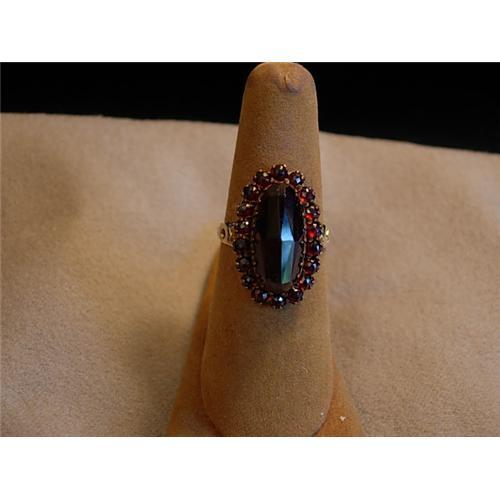 Attractive Circa 1900 Garnet Ring with 14kt yellow gold ring mount set with one navette shaped large oval faceted garnet surrounded by numerous rose cut garnets set in a yellow gold ring mount (top where garnets are set is low grade gold). This is a WONDERFUL piece in great condition.