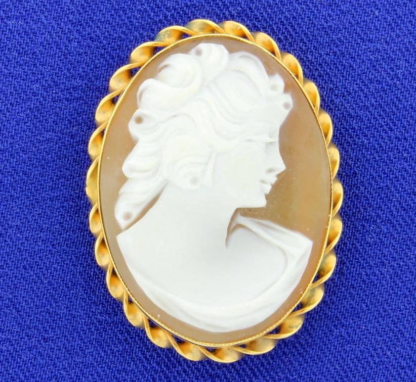 This gorgeous 14k yellow gold carved Cameo pendant / pin combination is breathtaking! The carving is very detailed and is very large. This is a very desirable vintage cameo. The pin/pendant is 1 3/8" long and 1" wide. 6.6g