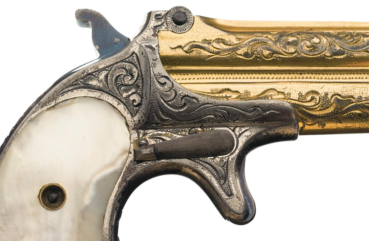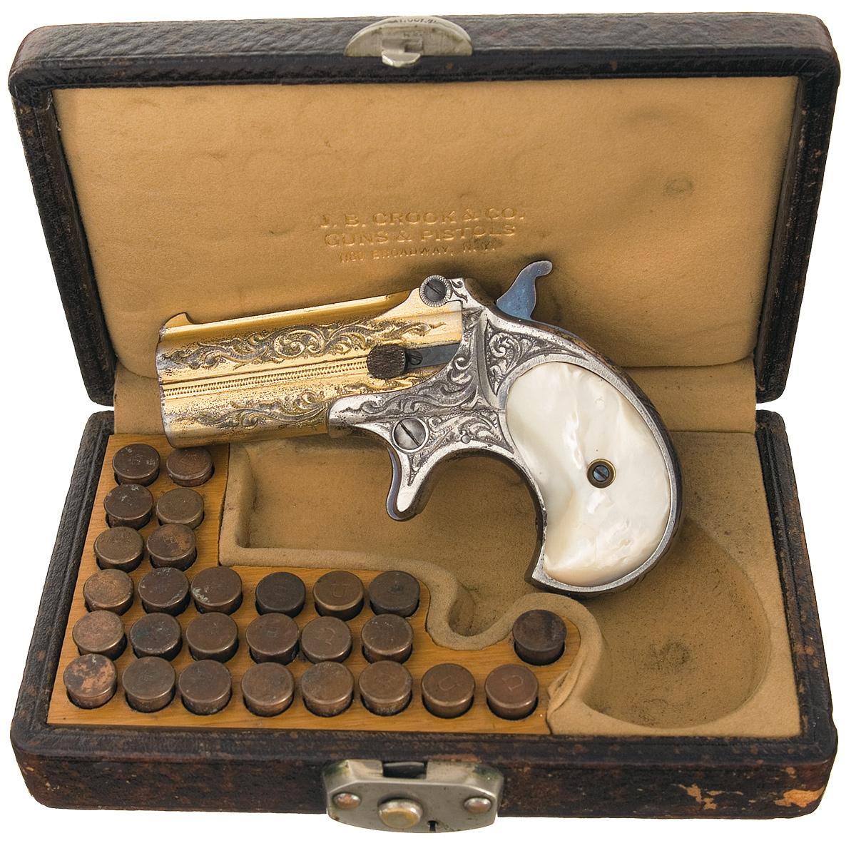 This is an example of a factory engraved Type II, or Model Number 3, derringer manufactured from 1888 to 1911. The derringer has the manual extractor and is marked "REMINGTON ARMS CO., ILION, N.Y." on the barrel rib. As stated this derringer features factory engraving. The sides of both barrels have scroll engraving with a star burst pattern around the hinge. The sides of the frame are adorned with a scroll engraving on a punch dot background with wedges of scrollwork on the backstrap between an engraved wavy line border. Matching serial number on the frame and barrels. Gold washed barrels, silver plated frame with remaining surfaces niter blue. Fitted with pearl grips. Complete with a leather bound wooden case with fitted chamois lining. The interior of the lid is retailer marked in gold marked text "J.B. CROOK & CO. / GUNS & PISTOLS / 1180 BROADWAY, N.Y.". The case has a cartridge block for 27 rounds (27 cartridges are included). This is very unusual as this type of "trophy" type engraved, gold, and silver treatment by the factory was usually reserved for larger frame presentation pieces. It is very seldom found on small frame pistols.