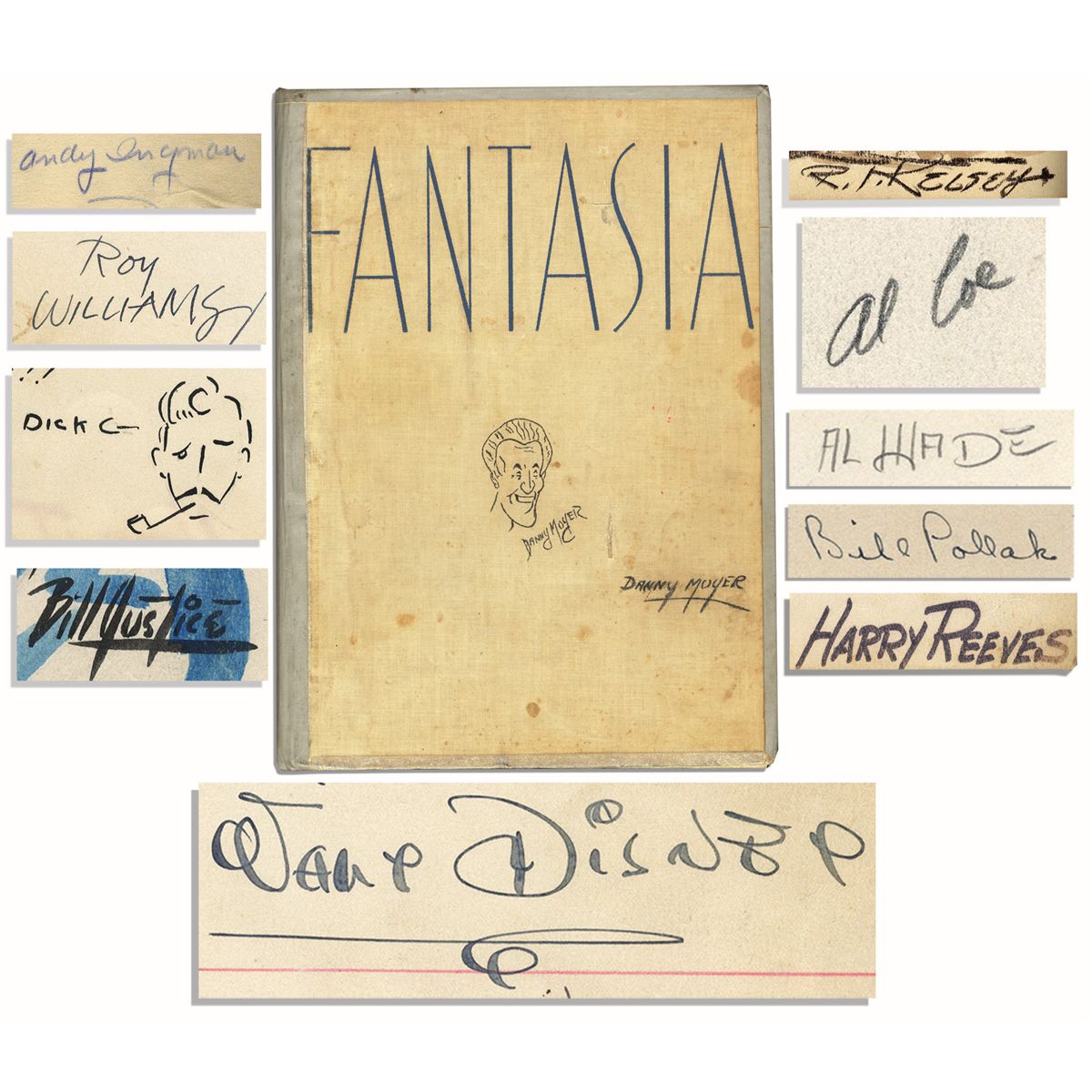 Scarce Walt Disney signed copy of his animated masterpiece, ''Walt Disney's Fantasia'' by Deems Taylor. With an introduction by Disney and a foreword by Leopold Stokowski, conductor of the Philadelphia Orchestra who scored the motion picture. Simon and Schuster: New York: 1940. First edition. Book has ''Danny Moyer'' written to cover and is signed by various Disney members inscribing notes to Moyer, including Disney himself who signs title page, ''To Danny Moyer / With Best Wishes / Walt Disney'' in his iconic handwriting. Book has 20+ incredible personalized illustrations throughout, presumably by various Disney illustrators who additionally write personal notes to Moyer wishing him good luck in his next endeavor. Illustrated book contains a wealth of background information on the groundbreaking animated classic, including blurbs about the pieces of music performed for it. 158pp. are bound in putty color cloth boards with blue print lettering, measuring 9.5'' x 13''. Some foxing, toning and wear throughout, and splitting along spine. Housed in a blue cloth slipcase with elegant leather spine. Very good condition.