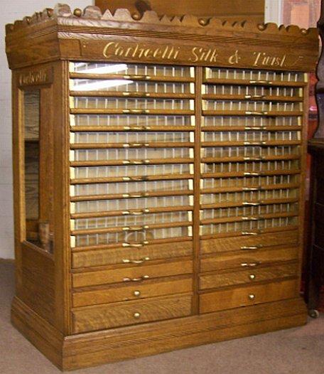 in oak with 22 glass doors over 8 pullout drawers. A hard to find counter top model. Ornamental upper crown and mirrored sides.